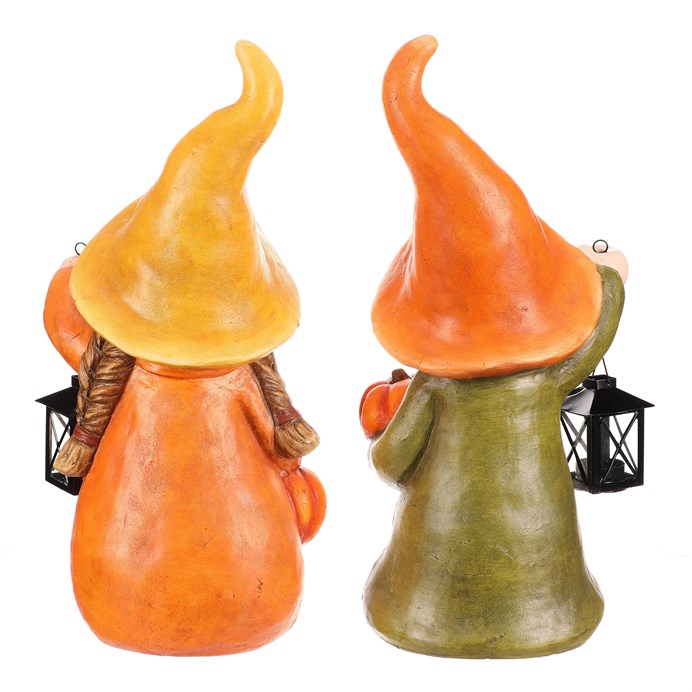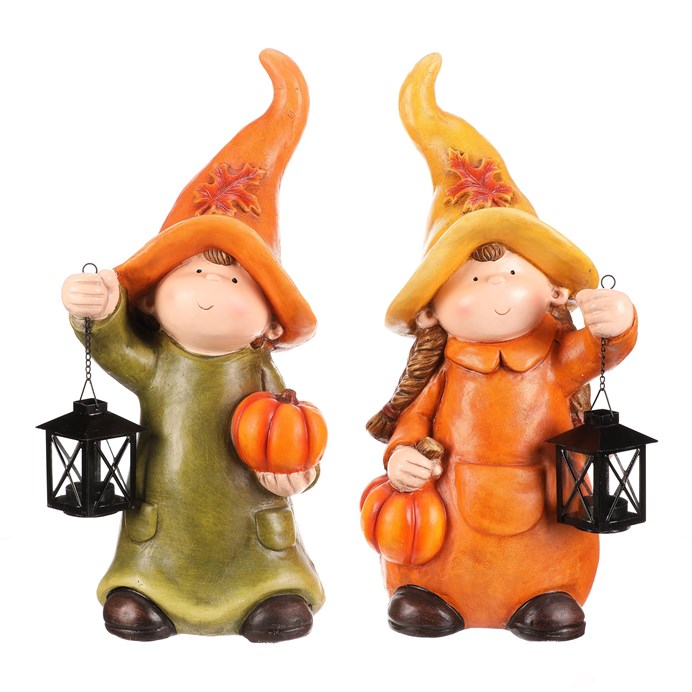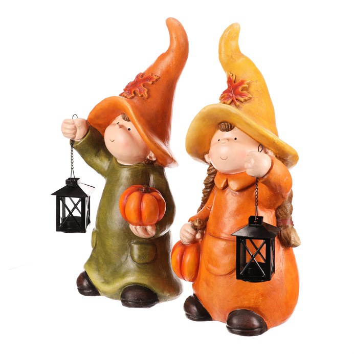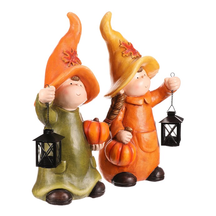 Dotaz na produkt Na splátky ještě dnesFigurky dětí z magnesia, které drží v rukou lucernu na vložení svíčky, budou roztomilým oživením vaší zahrady, terasy či balkonu. Jsou k dostání ve dvou podobách, přičemž obě jsou barevně laděné do podzimních barev. Tento nádech umocňují dýně, které drží v ručičkách a špičaté čepičky, které jsou ozdobené barevným listem.