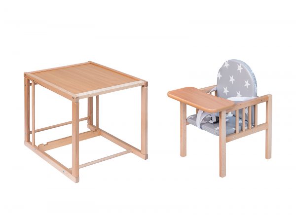 Dětská jídelní židle. Je určena pro krmení batolat a po rozložení tvoří samostatný stolek a židli pro starší děti. Vyrobeno z bukového dřeva. Má připevněné popruhy, takže zaručuje bezpečnost při krmení.
