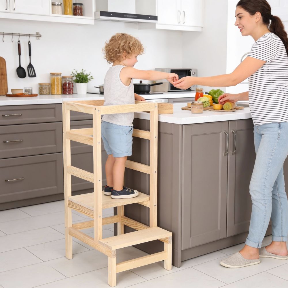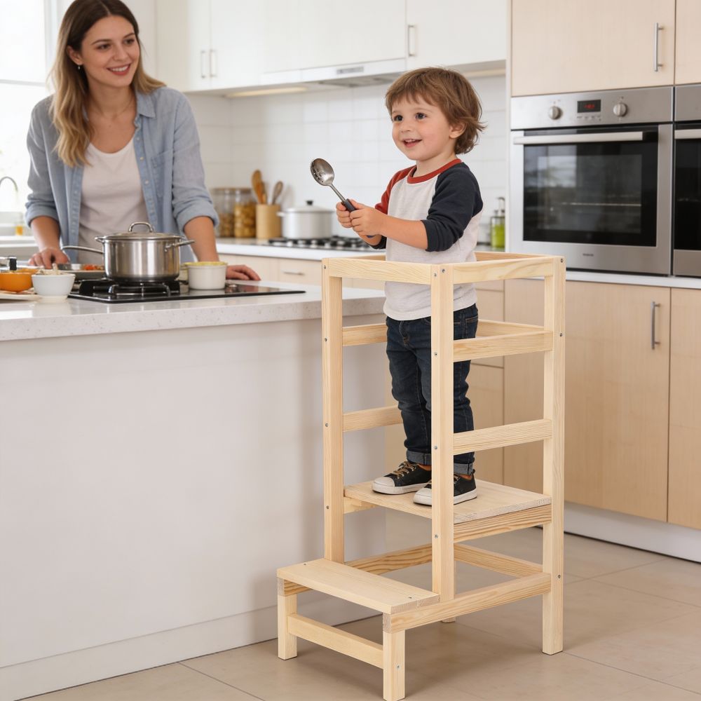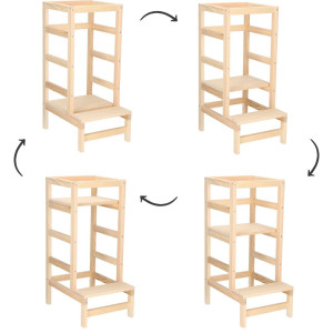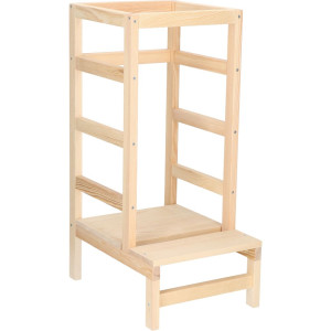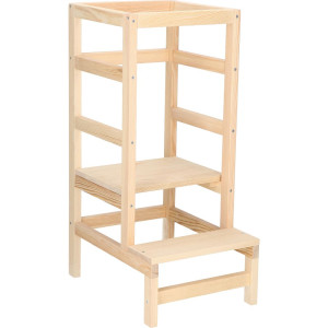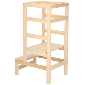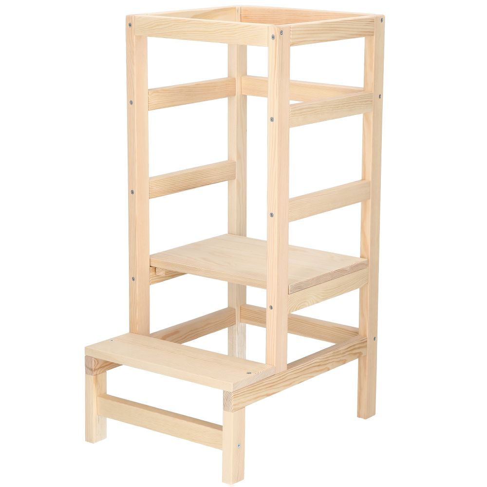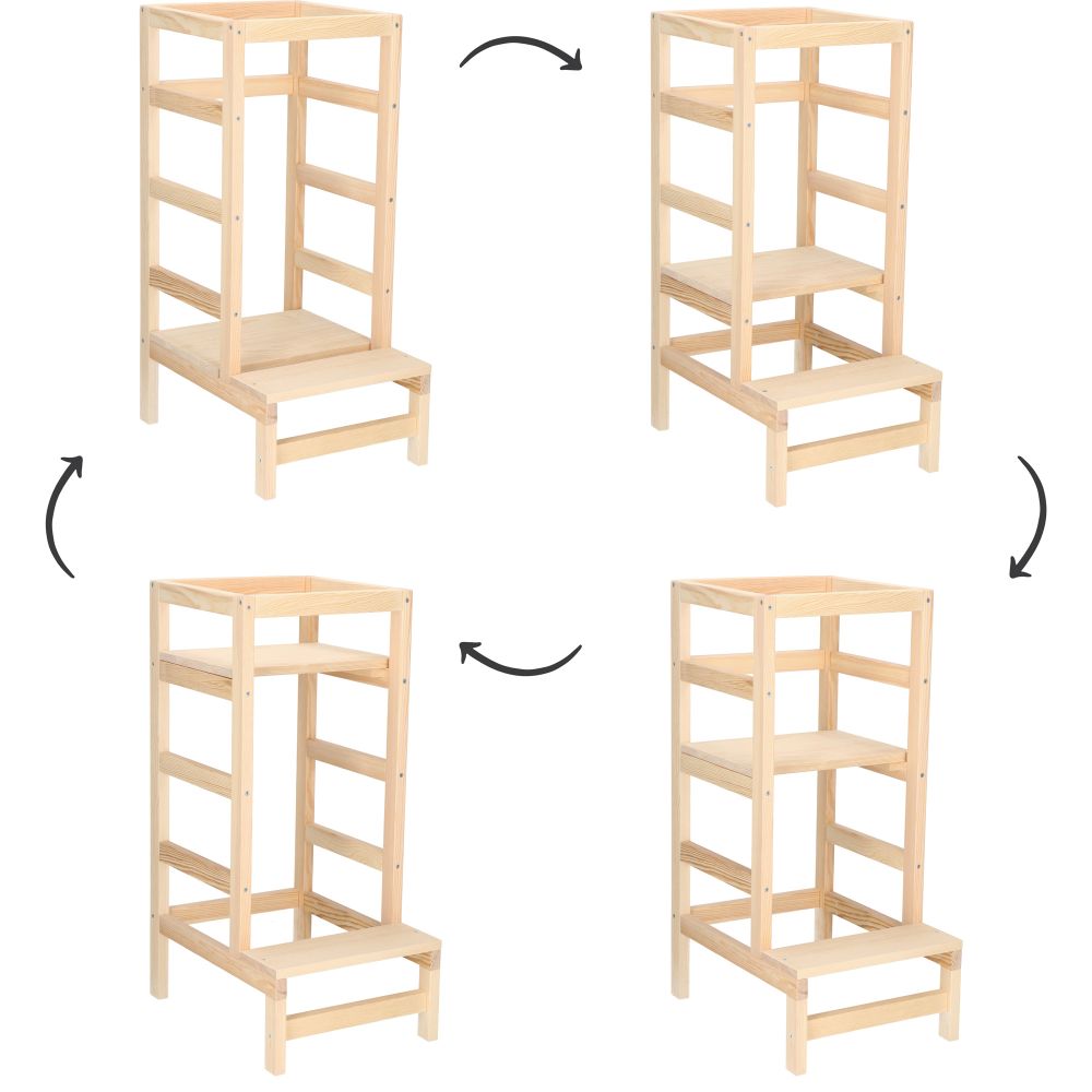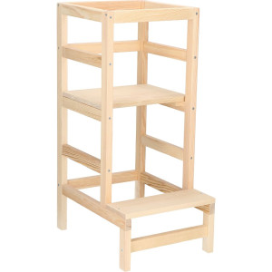 Věž roste spolu s dítětem a nabízí rychlé nastavení výšky ve 4 stupních, takže ji snadno přizpůsobíte aktuální výšce dítěte. Je vyrobena z kvalitního borovicového dřeva, má pečlivě zabroušené hrany a stabilní a bezpečnou konstrukci, která zajišťuje jistotu při každodenním používání.