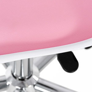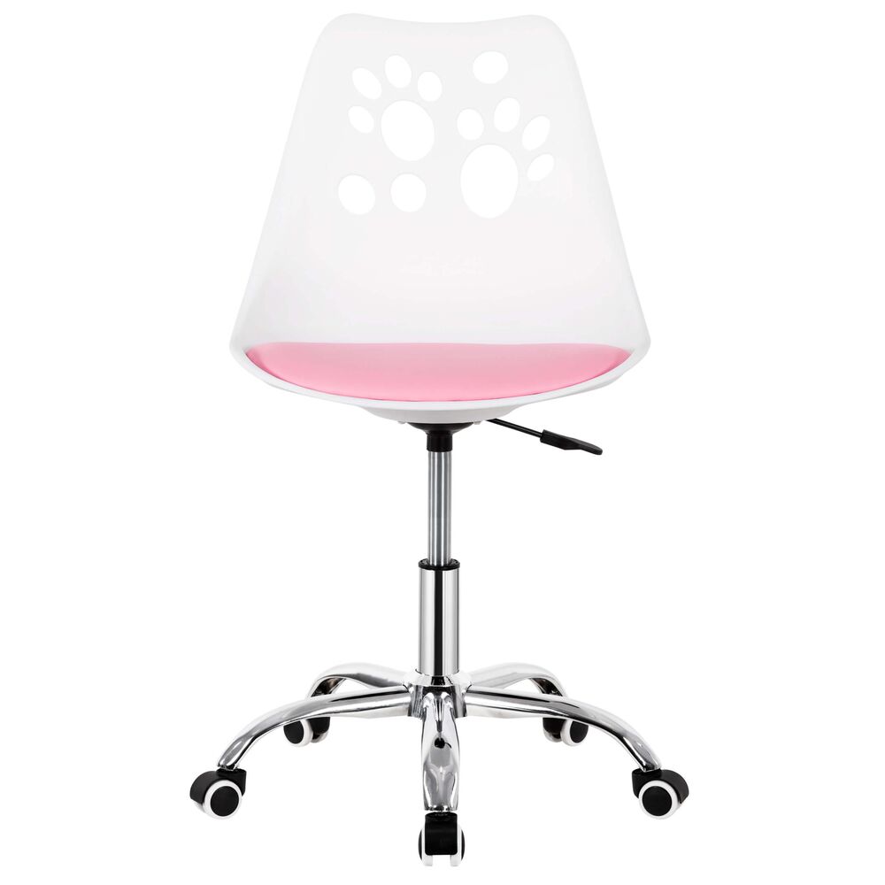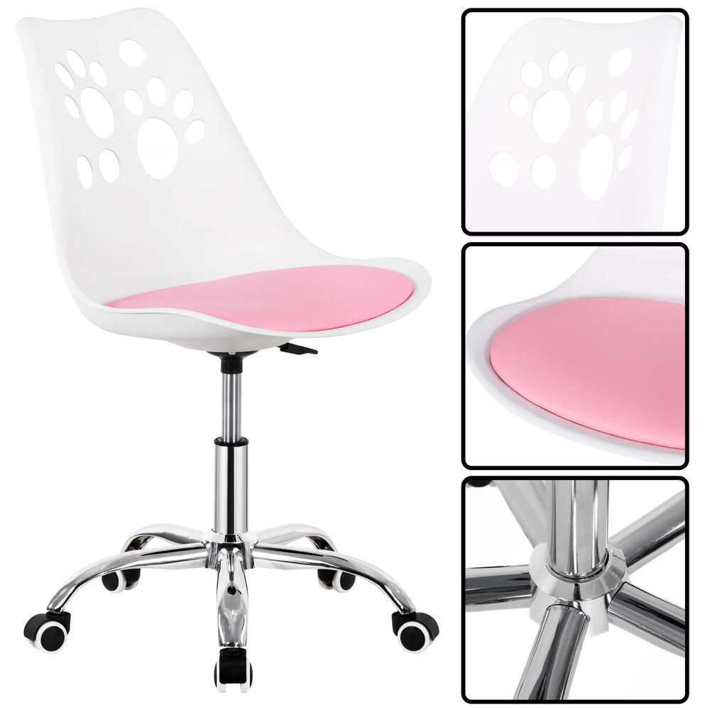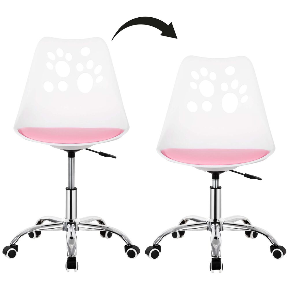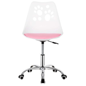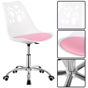 Stylová otočná židle k psacímu stolu v bílo-růžové barvě. Ideální do dětského, studentského i teenagerského pokoje. Výškově nastavitelná, s hladkými kolečky a ergonomickým tvarem pro zdravé sezení. Měkký polstrovaný sedák zajišťuje pohodlí při učení i hraní. Jemné pastelové tóny a opěradlo s výřezy ve tvaru tlapky dodají pokoji hravý vzhled. Snadná údržba a odolné zpracování – ideální k PC i na domácí úkoly. Nosnost 120 kg.