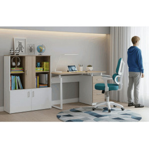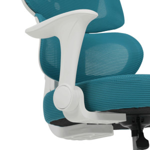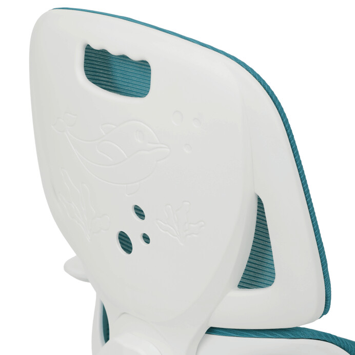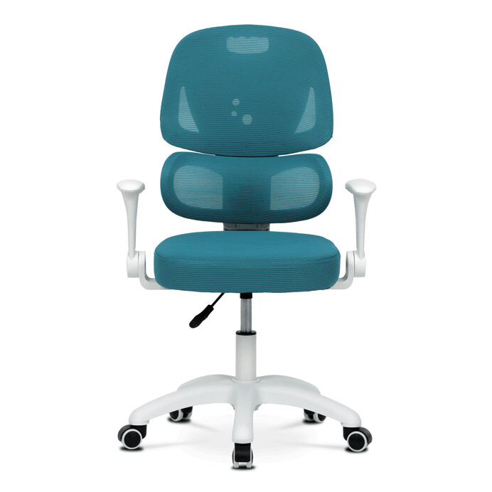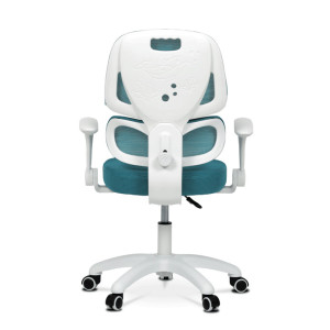 Dětská židle s modrou síťovinou nabízí pohodlné a vzdušné sezení díky prodyšnému materiálu, který podporuje cirkulaci vzduchu. Opěradlo je vybaveno výškově nastavitelnou bederní opěrkou, která zajišťuje správnou podporu spodní části zad, a výškově nastavitelným opěrákem pro individuální přizpůsobení. Odklápěcí područky umožňují snadnější přístup k pracovnímu prostoru a zároveň šetří místo. Plastový bílý kříž zajišťuje stabilitu a lehkost celé židle, zatímco kolečka jsou vhodná pro tvrdé podlahy, což usnadňuje pohyb po místnosti. Výškově nastavitelný sedák umožňuje optimální přizpůsobení výšky sezení podle potřeby dítěte.