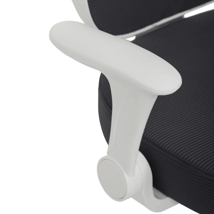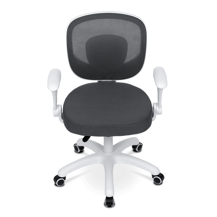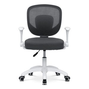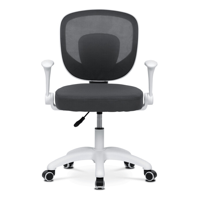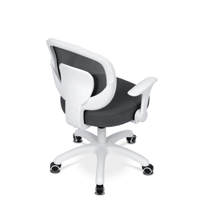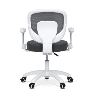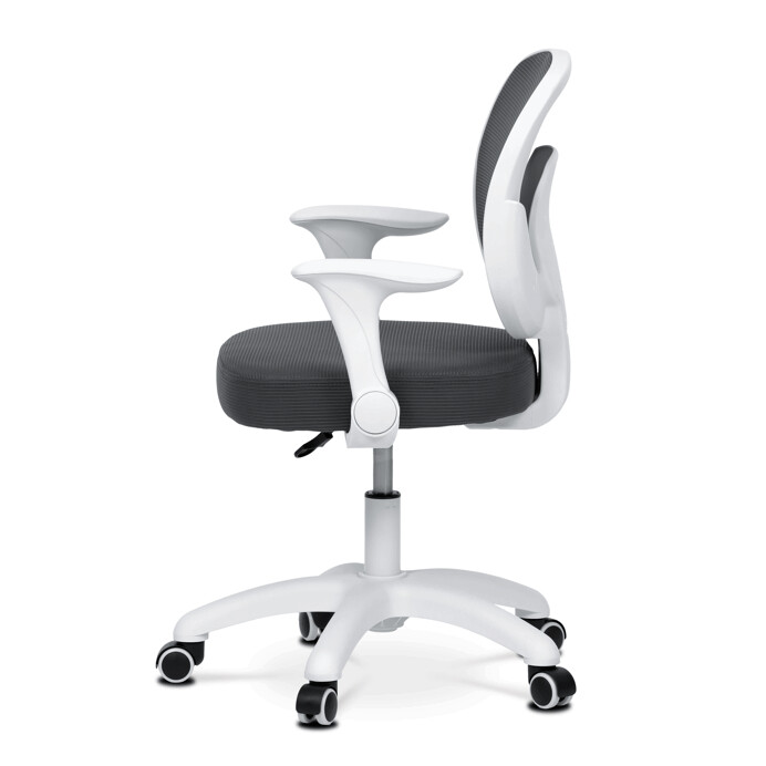 Dětská židle s šedým síťovinovým potahem nabízí prodyšné a pohodlné sezení vhodné pro mladší uživatele. Opěradlo je z lehké a pevné síťoviny, která podporuje cirkulaci vzduchu, zatímco sedák je čalouněný látkou stejné barvy pro příjemný komfort. Bílé plastové nohy s pěti rameny zajišťují stabilitu a jsou vybaveny kolečky určenými pro tvrdé podlahy, což umožňuje snadný pohyb bez poškození povrchu. Odklápěcí područky přispívají k flexibilitě používání a výškově nastavitelný mechanismus umožňuje přizpůsobení výšky sedáku podle potřeby dítěte. Židle je navržena tak, aby kombinovala funkčnost s jednoduchým designem vhodným do dětských pokojů.