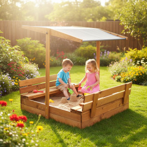 Důmyslná konstrukce pískoviště má dvě postranní lavičky s opěradlem pro pohodlné posezení dětí nebo dohlížejících rodičů.