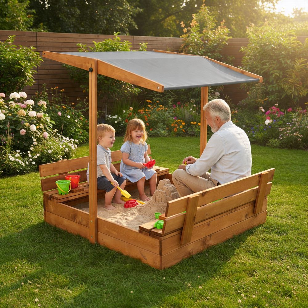 Dřevěné pískoviště s nastavitelnou stříškou, lavičkami s opěradlem a podložkou. Rozměry 120x120 cm cm. Skvělá zábava i pro ty nejmenší děti. Pískoviště je vybaveno dvěma postranními lavičkami. Nastavitelná stříška s textilním potahem účinně chrání před sluncem a deštěm. Bezpečná, robustní konstrukce. Proti povětrnostním vlivům a dřevokaznému hmyzu ošetřeno hloubkovou lazurou hnědé barvy. V ceně geotextilní podložka a plachta.