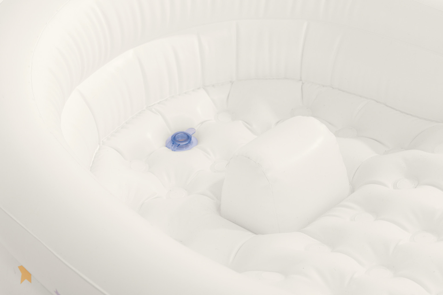 Dětská nafukovací vanička s potiskem hvězdiček. Lehká a snadno přenosná s měkkým a pohodlným povrchem pro šetrné koupání. Podpůrný výstupek pomáhá zabránit sklouznutí miminka. Balení obsahuje ruční pumpu.