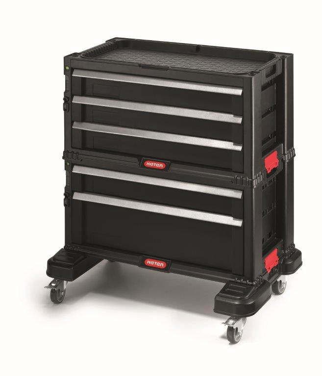 Dílenský vozík je složen ze dvou samostatných bloků, které lze snadno rozdělit a používat jednotlivě. Stohovatelné provedení umožňuje přidávat a ubírat další bloky se zásuvkami dle potřeby. Podstavec s kolečky je možné také snadno odejmout. Přední kolečka jsou opatřena praktickou brzdou.