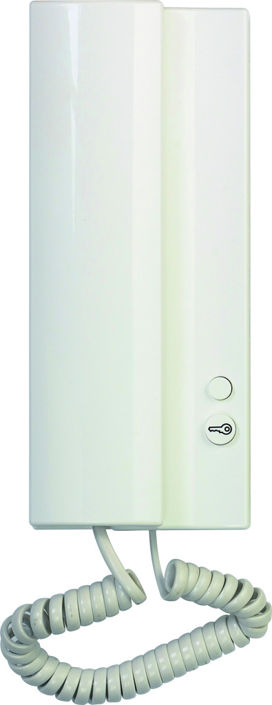 Nástěnný domácí telefon Tesla Elegant bílé barvy s bzučákovým vyzváněcím signálem je určený ke komunikaci s elektrickým vrátným ve vícevodičových audiosystémech (4+n), například v panelových domech.