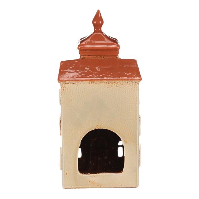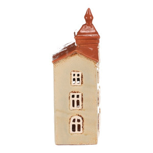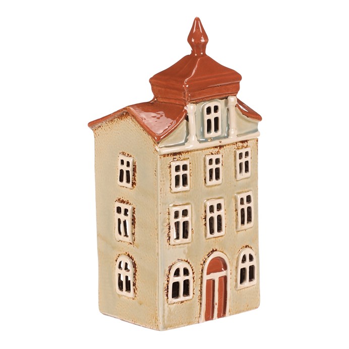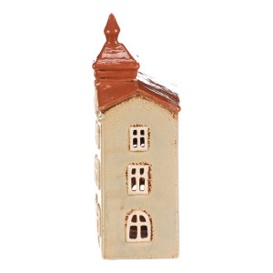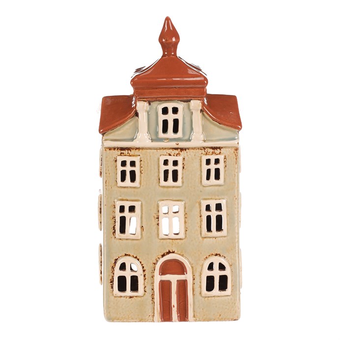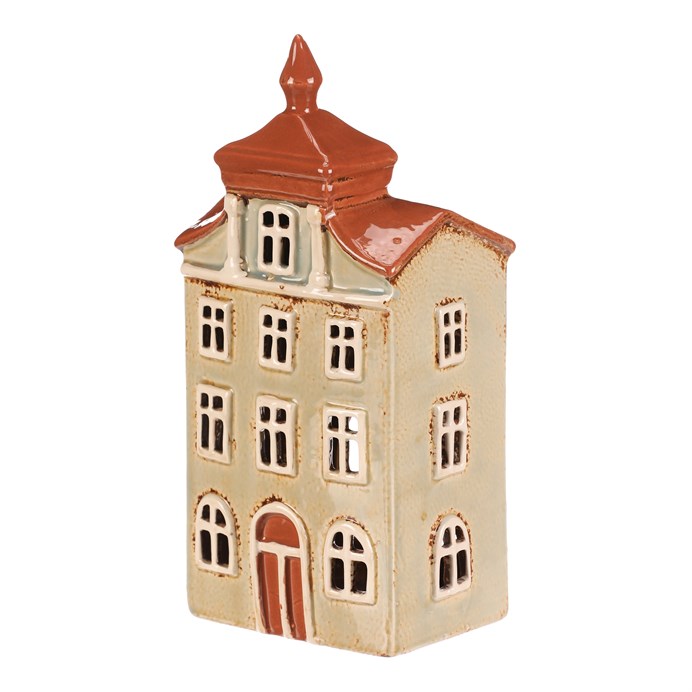 Dotaz na produktKeramický městský domek se světle zelenou fasádou a oranžovou střechou připomíná domy z malebných historických náměstí. Prostor na čajovou svíčku z něj dělá nejen krásnou dekoraci, ale i zdroj útulného světla, které bude jemně prosvítat skrze všechna okénka. Ideální dekorace pro podzimní a zimní večery.