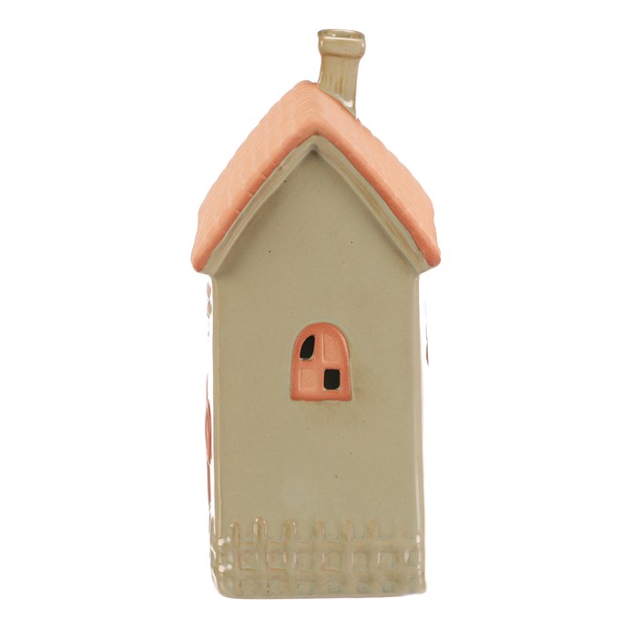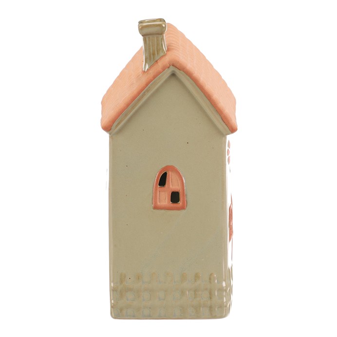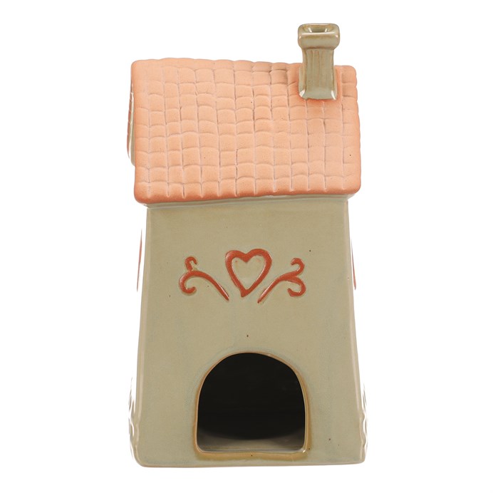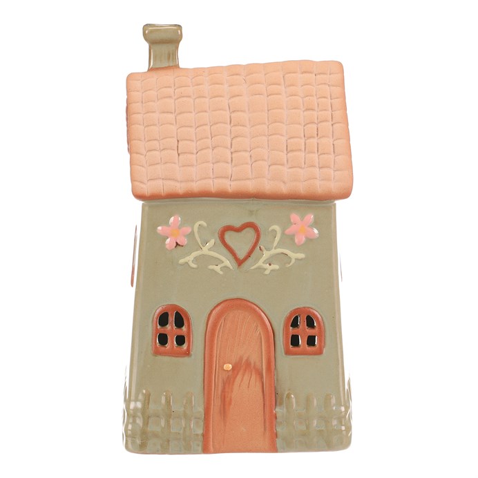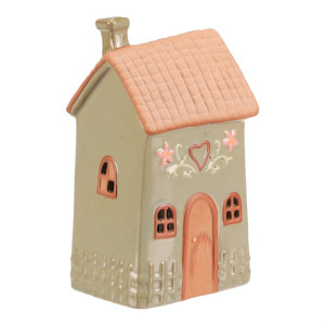 Dotaz na produktKeramický domeček v zeleném odstínu je určený pro umístění čajové svíčky, která v něm vytváří příjemnou atmosféru díky průsvitným okénkům a otvoru v komínku. Povrch je hladký s jemným leskem a střecha je zdobená reliéfními taškami v teplé terakotové barvě. Dekorativní malby květin a srdce na přední straně podtrhují jeho rustikální charakter. Domeček je vhodný jako dekorace do interiéru, kde přispívá k útulnému vizuálnímu efektu a měkkému rozptýlenému světlu.