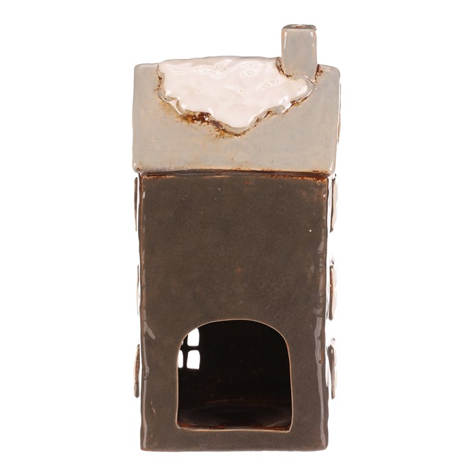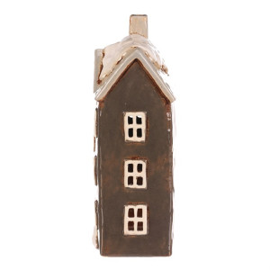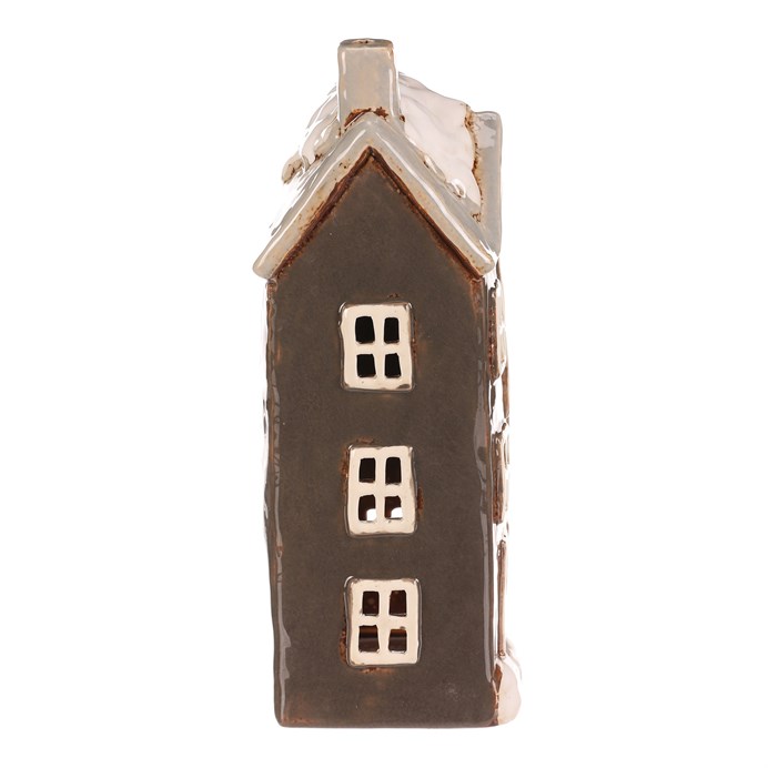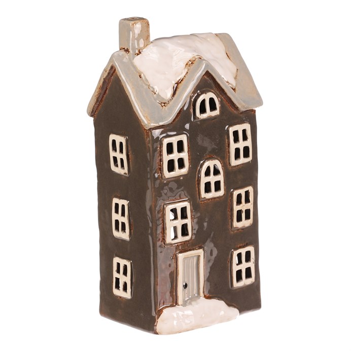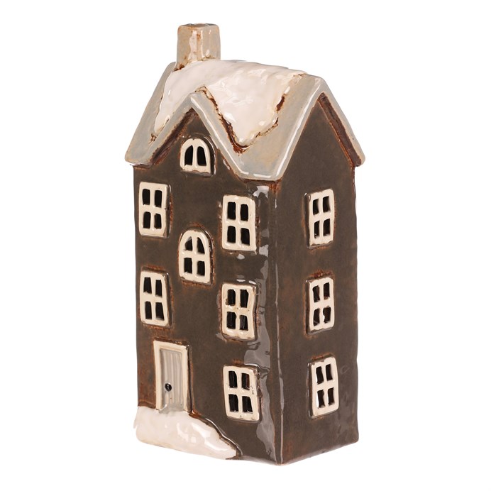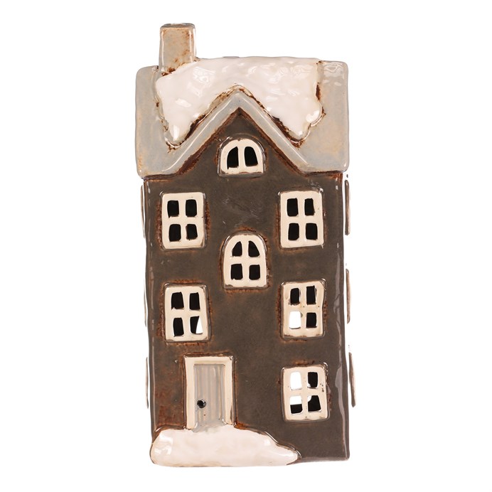 Dotaz na produkt Na splátky ještě dnesKeramický patrový domek s tmavě šedou fasádou a světle šedou stříškou, která je pokrytá trochou sněhu, je skvělou dekorací na dlouhé podzimní a zimní večery. Je v něm prostor pro čajovou svíčku, což umožňuje vytvářet kouzelnou atmosféru, díky paprskům pronikajícím ven skrze všechna okénka. Ideální dekorace pro příjemné zútulnění domova.