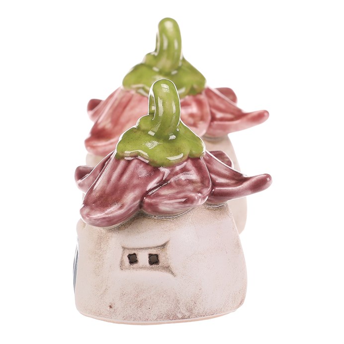 Dotaz na produktKeramický domeček s LED osvětlením v červenozeleném barevném provedení přináší do interiéru jemnou atmosféru a dekorativní efekt. Jeho tvar připomíná květinu s okvětními lístky tvořícími střechu a malým otvorem pro světlo, které jemně prosvítá. Díky praktickému otvoru v horní části lze domeček snadno zavěsit nebo postavit na poličku či stůl. Velikost S umožňuje variabilní použití v různých prostorách, kde vynikne jako originální doplněk s decentním osvětlením.