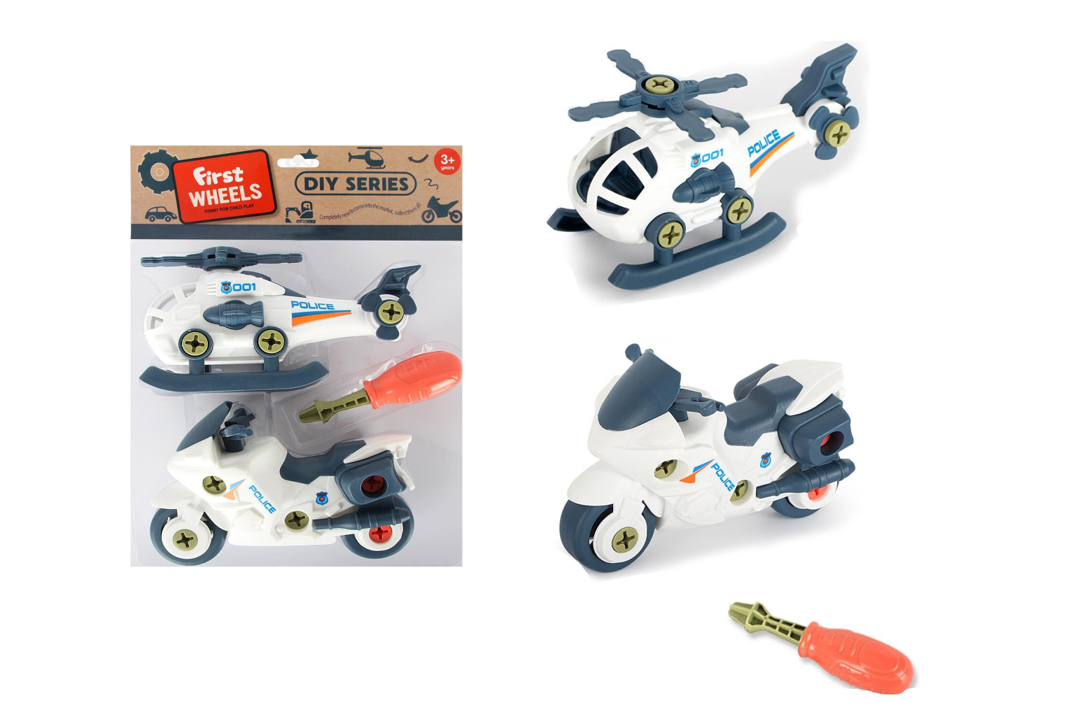 Dotaz na produktDopravní prostředky šroubovací. Velikost 15,5 cm. Obsah balení - helikoptéra, motorka, šroubovák.
