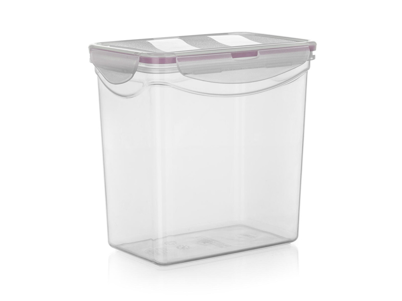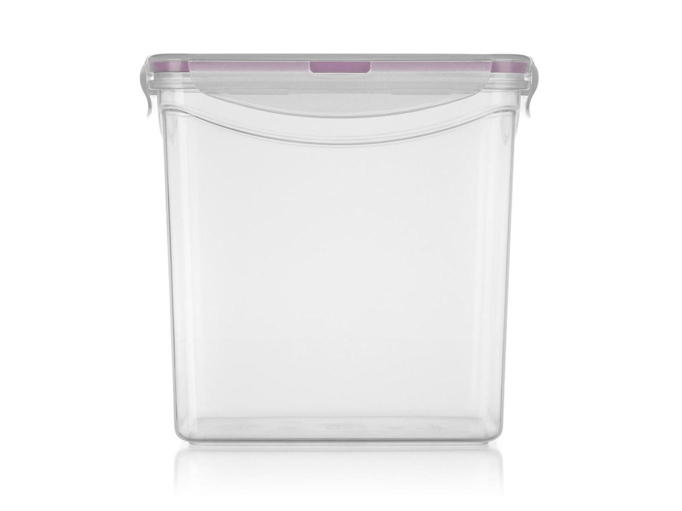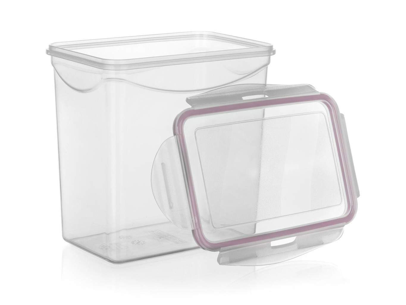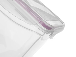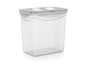 Plastová dóza na potraviny LARA, s růžovým silikonovým těsněním, zajišťuje vzduchotěsnost dózy.