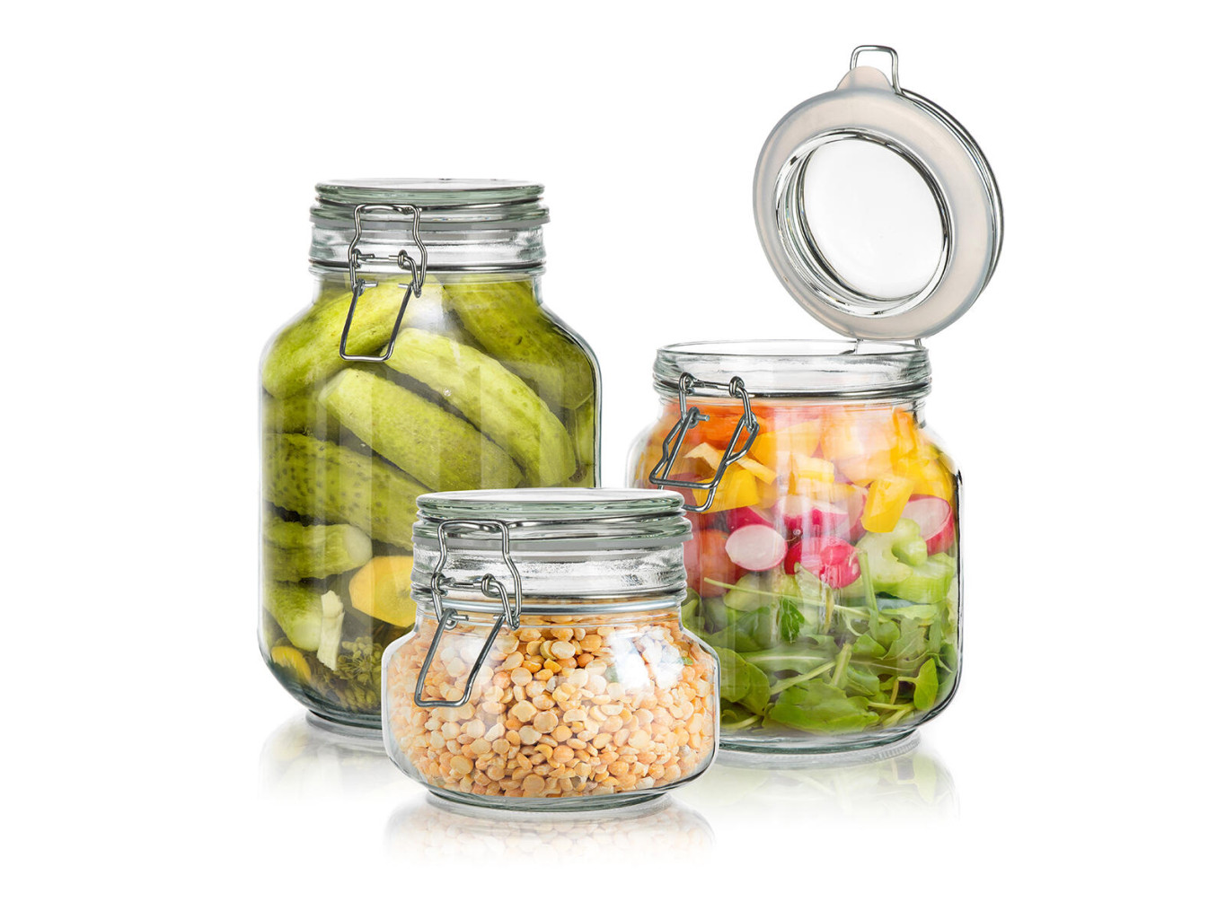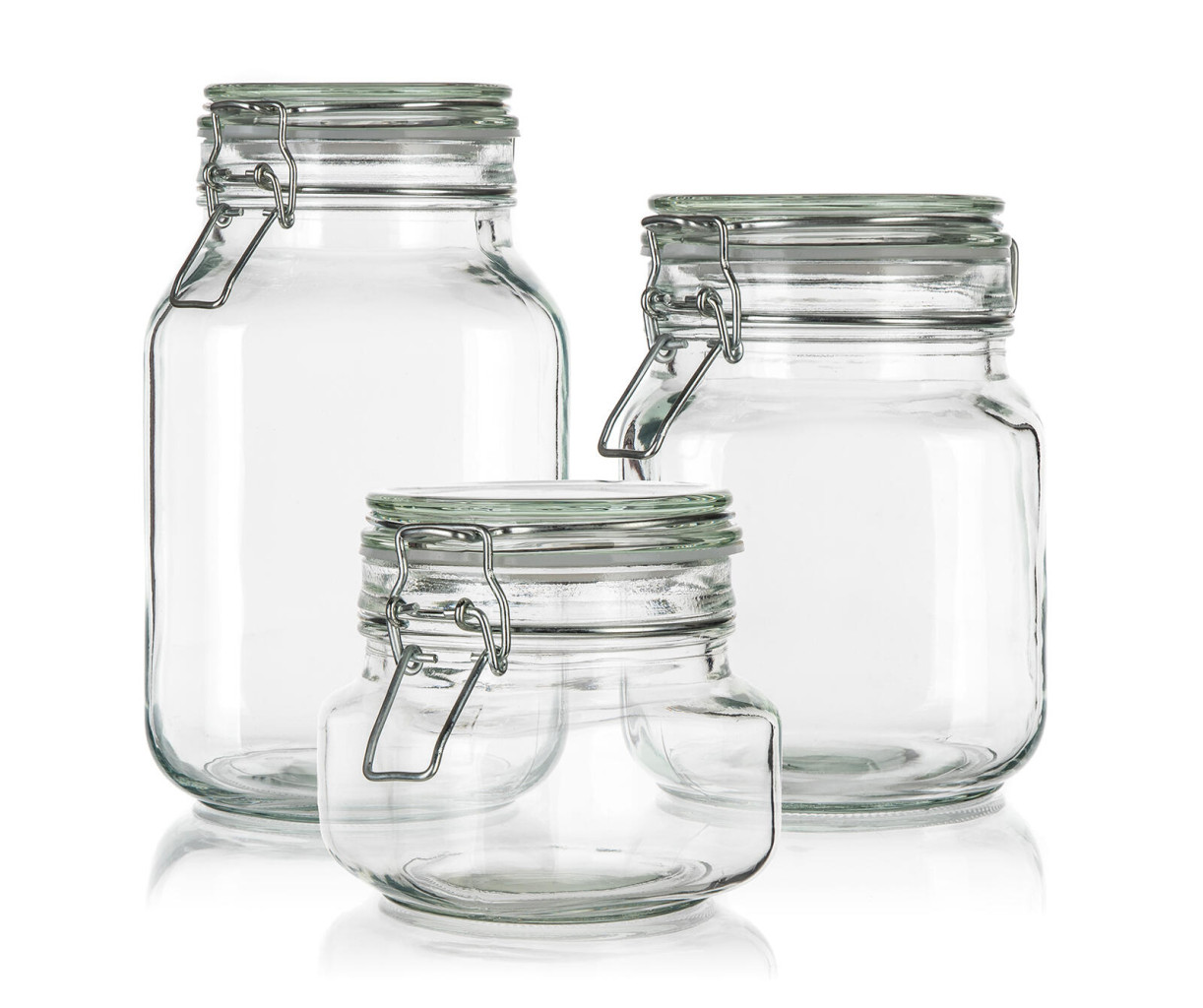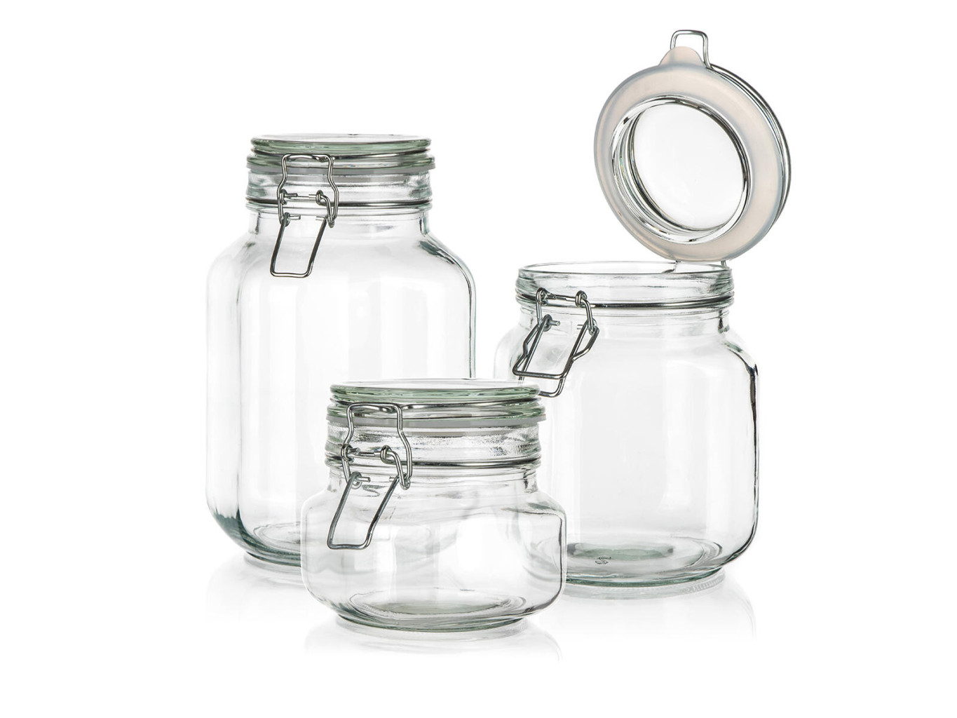 Sada skleněných hermetických dóz EREA se skleněným víčkem a kovovým zavíracím patentem,