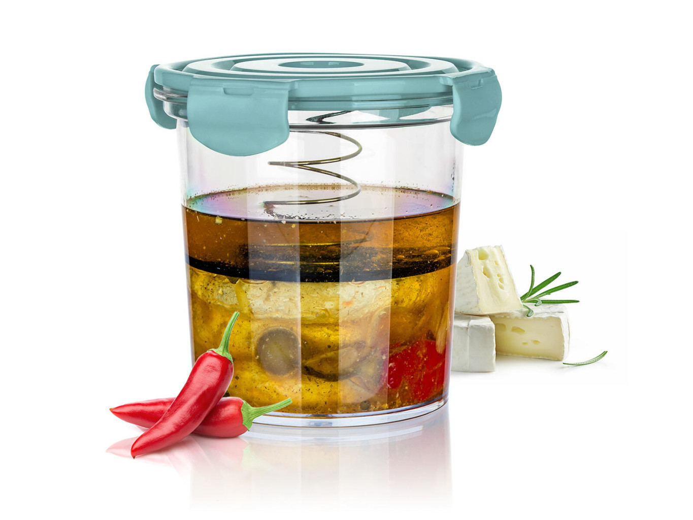 Zatlačením víka s klipy, opatřené pružinou, zamezíte přístupu vzduchu k potravinám.