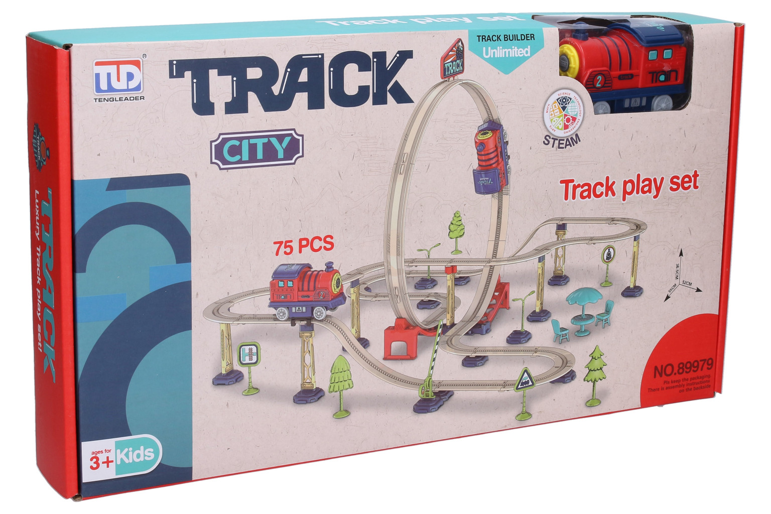 Dotaz na produktDráha vlaková se smyčkou. Rozměry dráhy 55x52x36,5 cm. Sada obsahuje 75 dílů. Obsahuje elektrickou mašinku 8,5 cm. Aktivace mašinky stiskem komína. Návod na sestavení na obalu. 2xAAA baterie do mašinky, nejsou součástí.