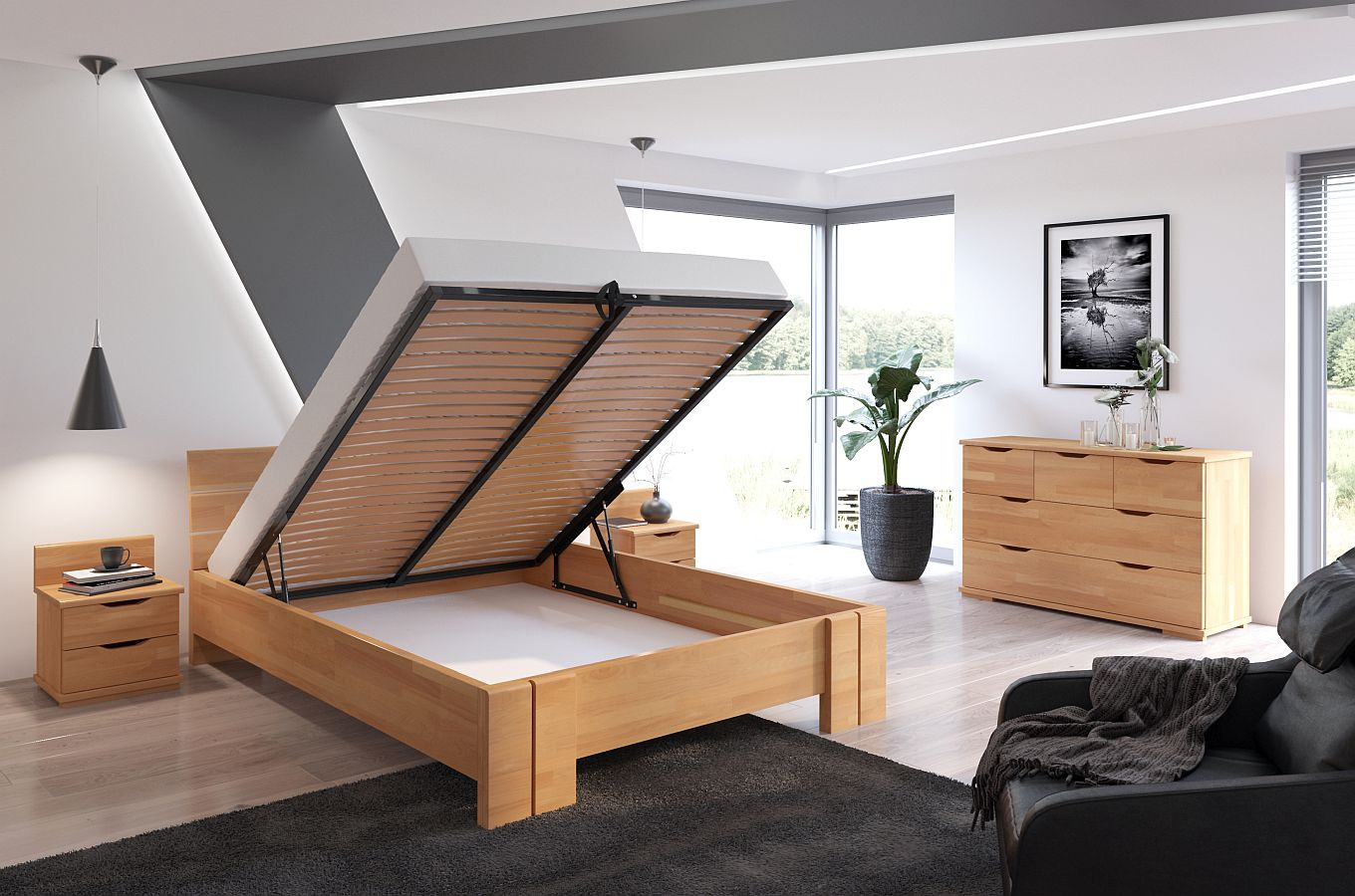 Charakteristickým rysem této postele je praktický box na lůžkoviny, který se snadno otevírá díky plynovým lahvím a speciální plastové rukojeti ve tvaru obrácené kotvy.