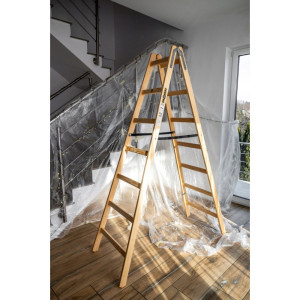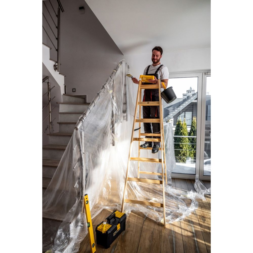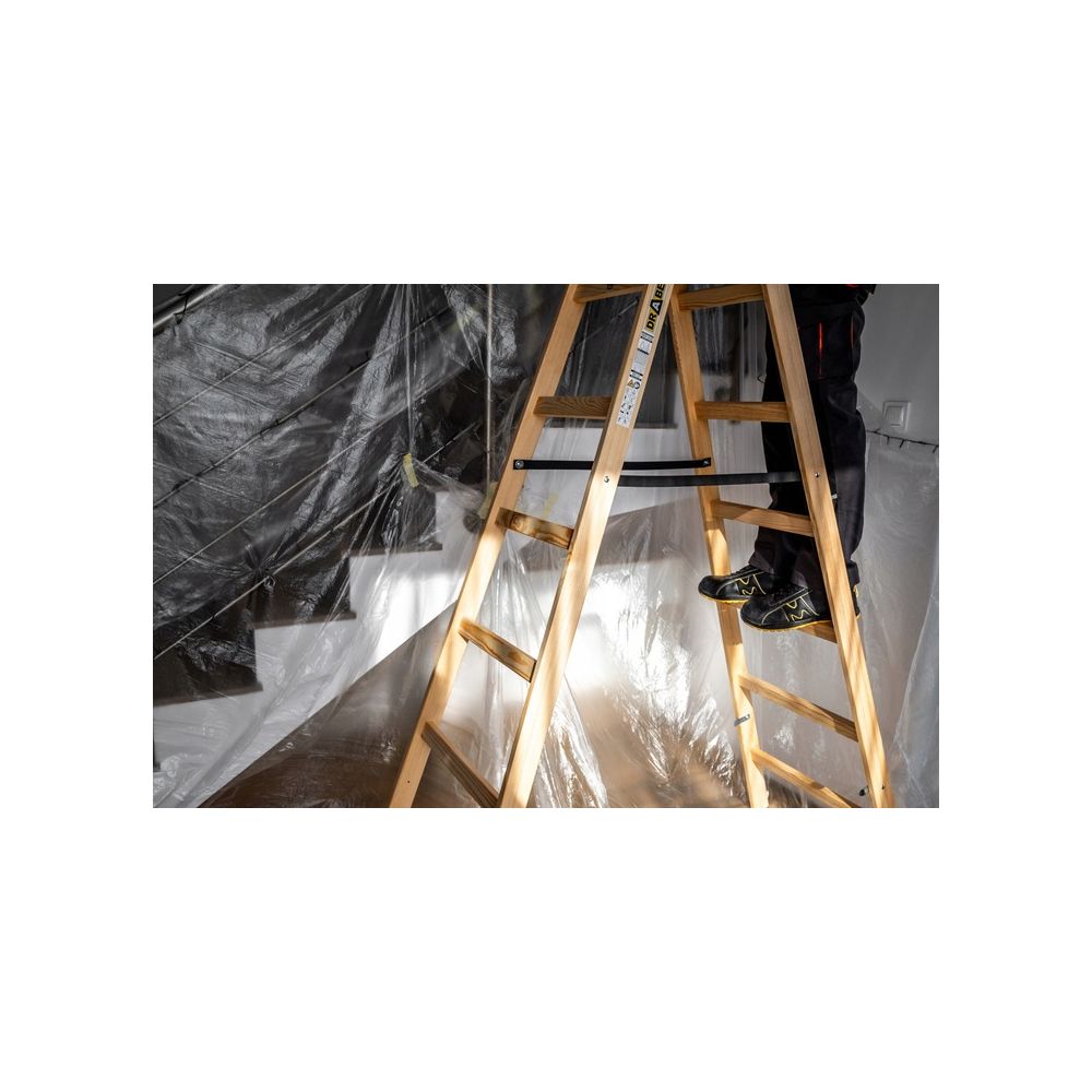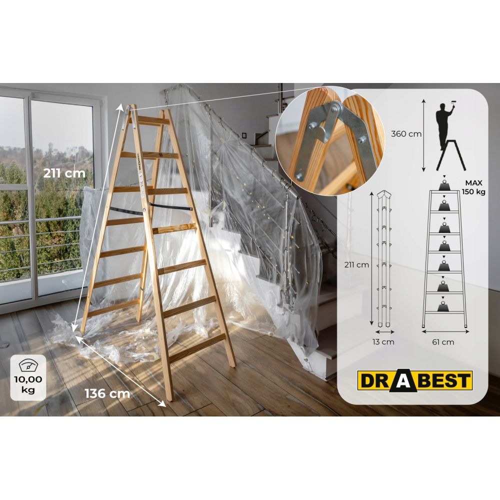 Dřevěné malířské štafle 2x7 stupňů oboustranné DRABEST DREW 2x7 PRO jsou ideální volbou pro profesionální i domácí použití. Jsou vyrobeny z vysoce kvalitního impregnovaného dřeva bez suků, které je odolné vůči vlhkosti, což zajišťuje dlouhou životnost i při pravidelném používání. Díky oboustrannému provedení můžete bezpečně pracovat z obou stran, což zvyšuje flexibilitu při práci.