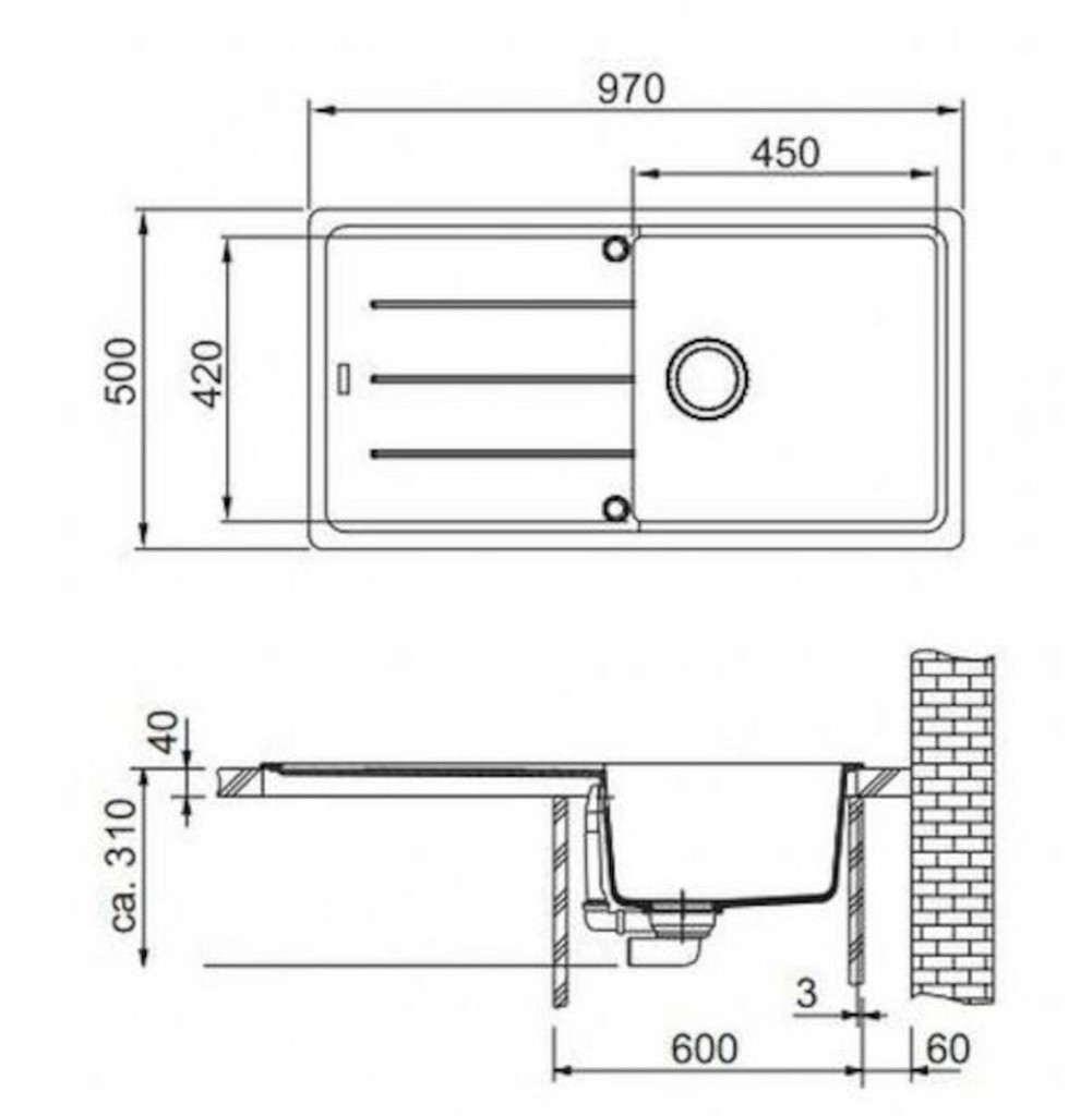 Spodní skříňka od 600 mmRozměry: 970 × 500 mmVýřez: 950 × 480 mm (Rádius 20 mm)Dřez: 450 × 420 × 200 mmCena zahrnuje:Sítkový ventil 3 1/2“ s přepademSifon pro úsporu místa 6/4“ s odbočkou na myčku...