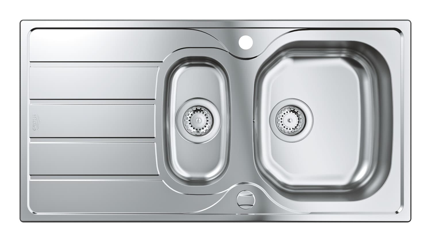 Dřez GROHE K400, 1,5sektorový, z nerezové oceli s odkapávačem, vestavný, s přepadem a automatickou odtokovou soupravou, 965 × 500 mm. 31564SD1