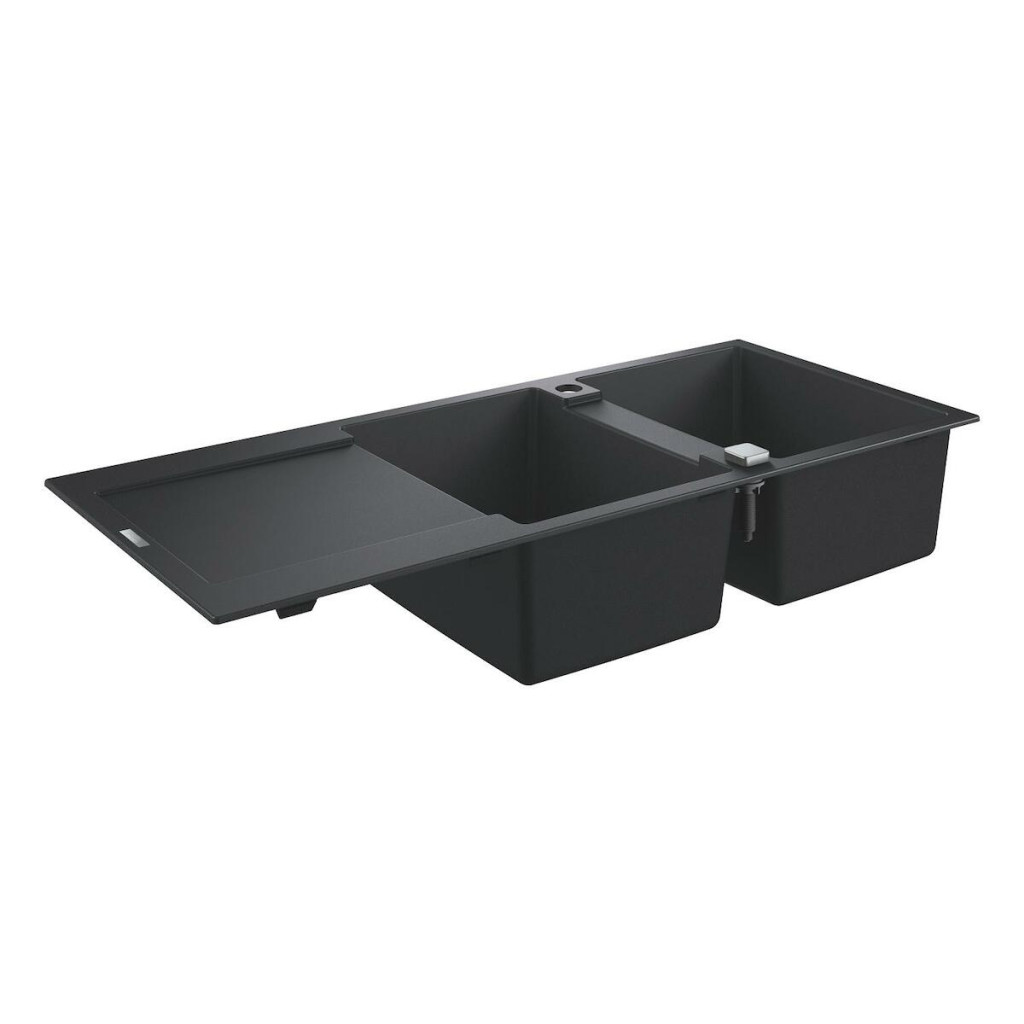 Dvojitý kompozitní dřez GROHE K500 s odkapávačem, 116 cm, Granite Black, svrchní montáž, 2 sektory, s přepadem a automatickou odtokovou soupravou. 31647AP0