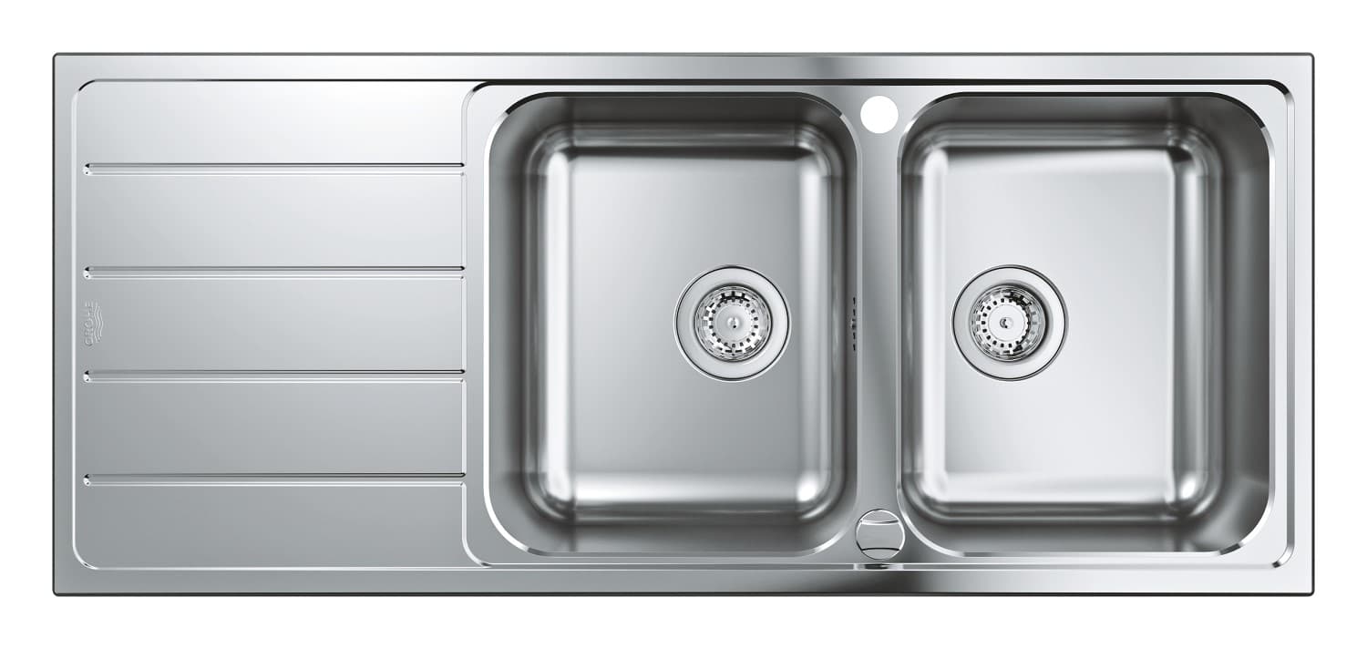 Dřez GROHE K500 z nerezové oceli, dvojitý, s odkapávačem, vestavný, s přepadem a automatickou odtokovou soupravou, 1160 × 500 mm. 31588SD1