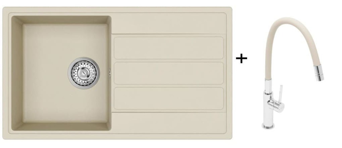 PARAMETRY:Balení: 1 ksDruh výrobku: set dřezu a baterie Materiál: Granit Barva popisná: béžová Barva základní: béžová Šířka: 76  cmHloubka: 17  cmDélka: 44  cmTvar dřezu: jednodřez S odkapávačem:...