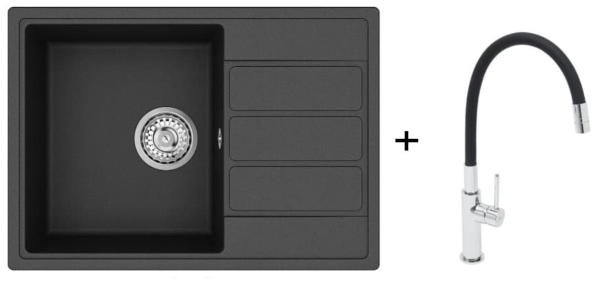 PARAMETRY:Balení: 1 ksDruh výrobku: set dřezu a baterie Materiál: Granit Barva popisná: černá Barva základní: černá Šířka: 62  cmHloubka: 17  cmDélka: 44  cmTvar dřezu: jednodřez S odkapávačem:...