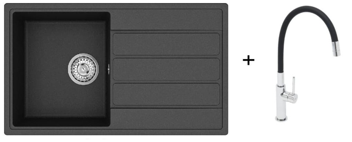 PARAMETRY:Balení: 1 ksDruh výrobku: set dřezu a baterie Materiál: Granit Barva popisná: černá Barva základní: černá Šířka: 76  cmHloubka: 17  cmDélka: 44  cmTvar dřezu: jednodřez S odkapávačem:...
