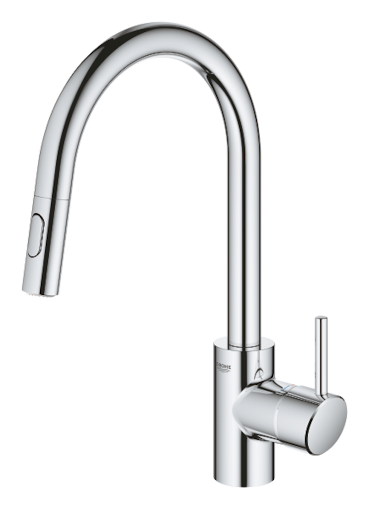 Páková dřezová baterie GROHE Concetto s vytahovací sprchovou hlavicí se 2 režimy proudu, vysoká výpusť otočná o 360°. Chromový povrch. Snadná instalace a spolehlivý výkon německých technologií.