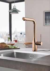 Páková kuchyňská baterie GROHE Essence s vysokou výpustí ve tvaru písmene L. Dřezová baterie vyrobená v Německu s vysokou, 360° otočnou výpustí a vytahovací sprchovou hlavicí. Barva: Warm Sunset