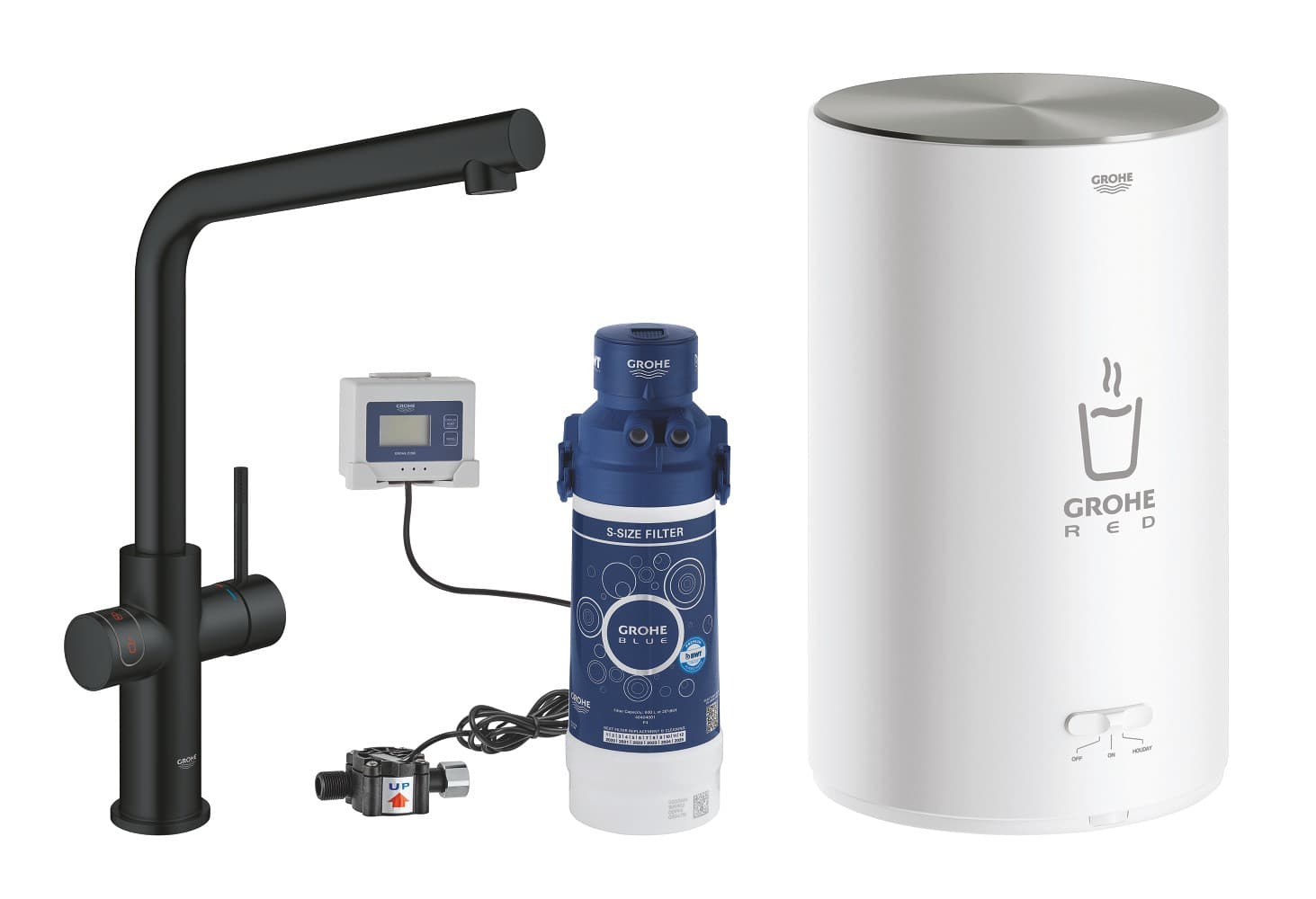 Pokud je vaše kuchyň zásobená průtokovým ohřívačem vody, zvažte pořízení směšovacího ventilu Coldfill (40841001) jakožto náhradu za vaši stávající baterii, který míchá studenou vodu z rozvodné sítě s vařící vodou ze systému GROHE Red. Budete tak mít k dispozici smíšenou vodu s nižší spotřebou a bez čekání.