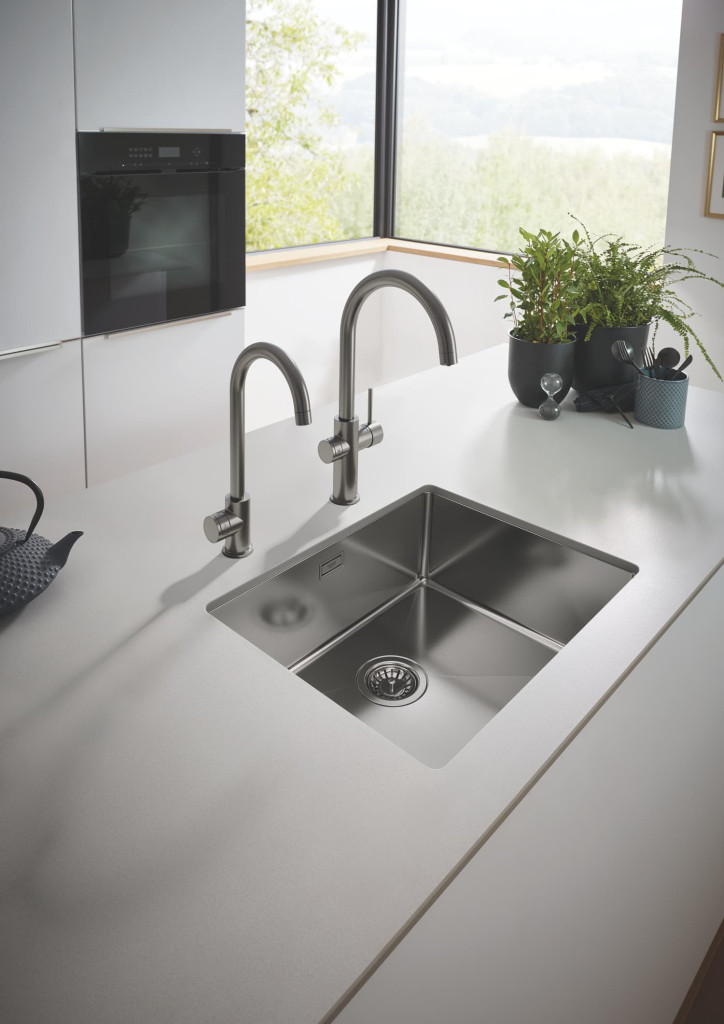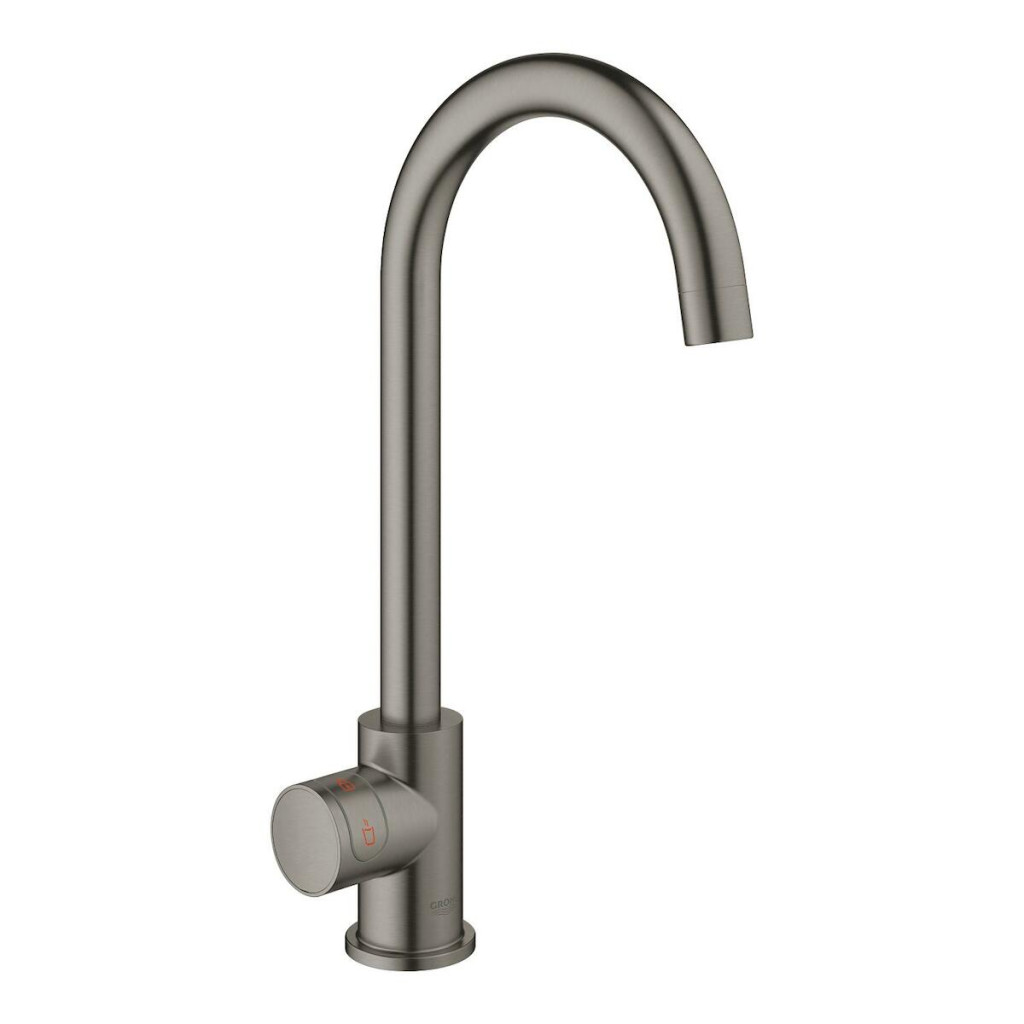 Stojánková baterie GROHE RED Mono s vysokou výpustí ve tvaru písmene C a povrchovou úpravou kartáčovaný Hard Graphite. Obsahuje filtrační sadu a bojler velikosti M pro vařící vodu bez čekání. Energetická efektivita třídy A a bezpečnostní technologie. 30085AL1