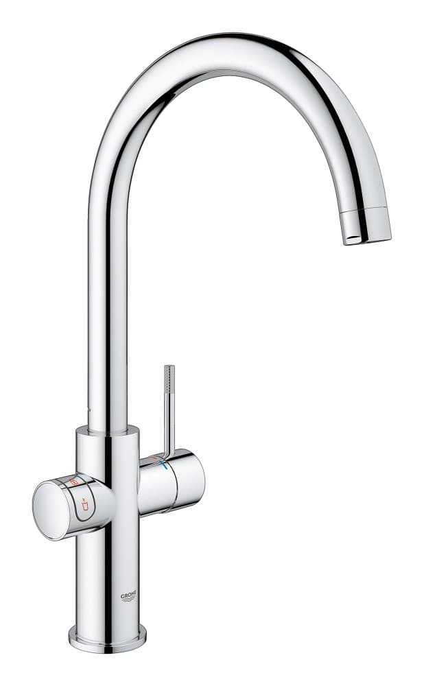 Kuchyňská baterie GROHE RED Duo (výpusť ve tvaru písmene C) s filtrační sadou a bojlerem velikosti M pro okamžitou vařící vodu. Chromový povrch. Energetická efektivita třídy A a bezpečnostní technologie