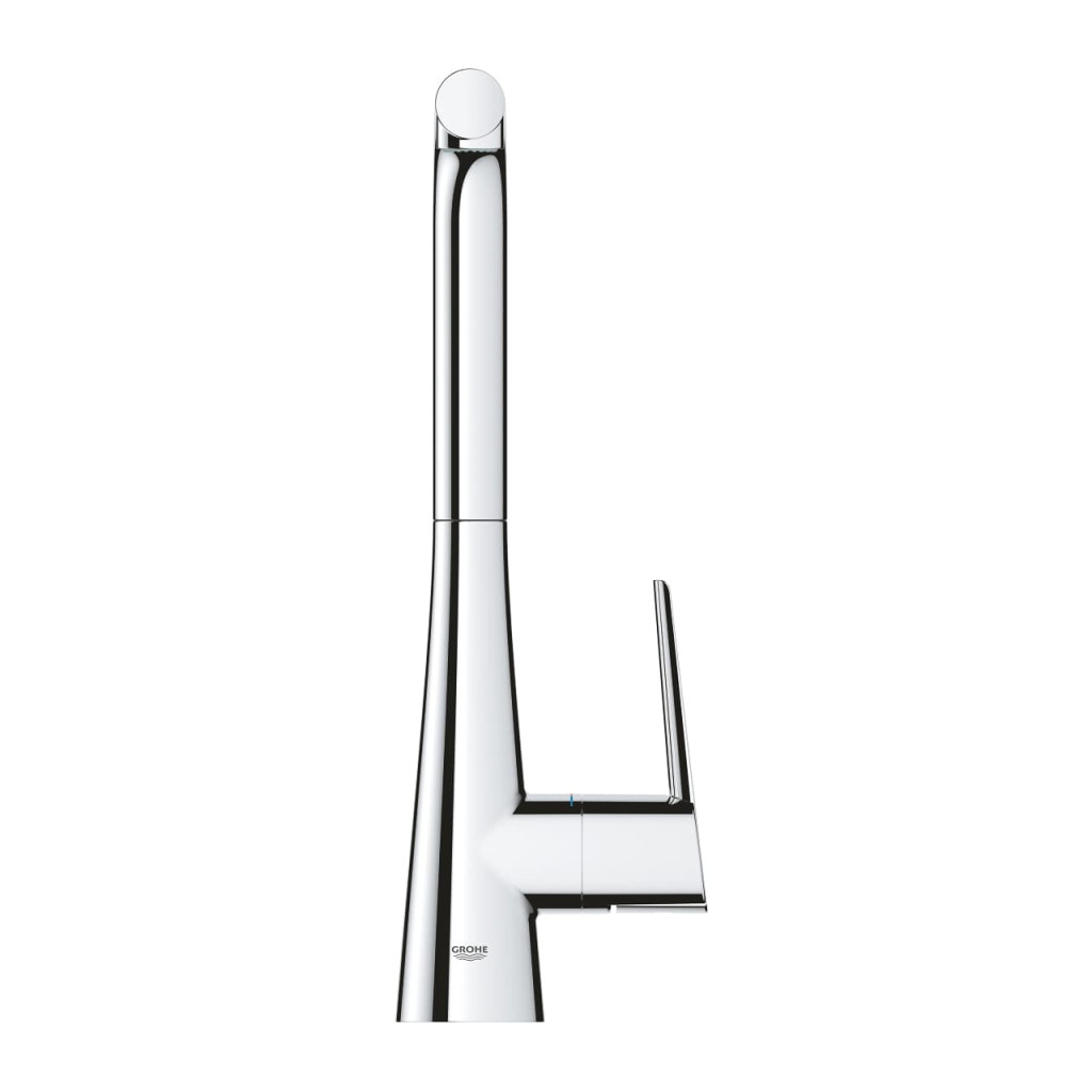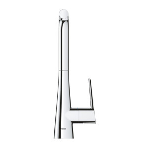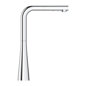Kuchyňská baterie GROHE Zedra. Páková dřezová baterie, vysoká výpusť ve tvaru písmene L s vytahovací sprchou se 2 režimy proudu, rozsah otáčení 360°, chromová úprava.
