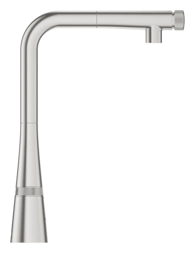 Kuchyňská baterie GROHE Zedra SmartControl. Vysoká baterie ve tvaru písmene L s vytahovací sprchou, 360° rozsah otáčení, povrch z nerezové oceli. Úspora vody. 31593DC2