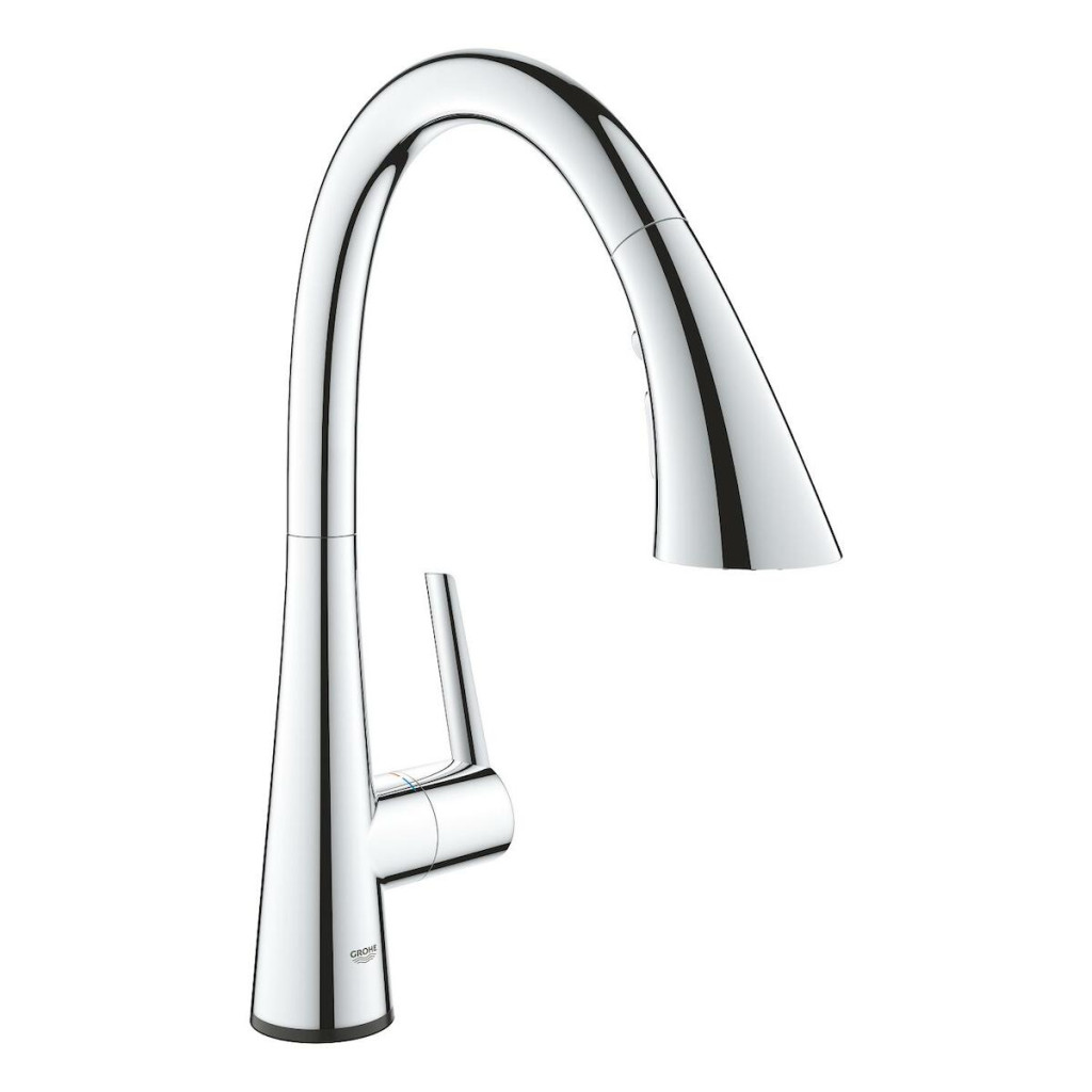 Kuchyňská baterie GROHE Zedra Touch. Páková dřezová baterie, vysoká výpusť ve tvaru písmene C s dotykovým ovládáním, vytahovací sprchou se 3 režimy proudu, rozsah otáčení 360°, chromová úprava. Úspora vody. 30219002