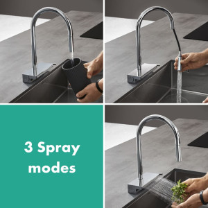 Potřebný standardní otvor pro baterii (35 mm) ve středové poloze vůči dřezu; vzdálenost od stěny dřezu max. 45 mmDoporučuje se jednodřez. Po ověření možný i dvojdřezFlexibilní hadice (G ⅜, DN15) s certifikací pro rozvod pitné vody k jednoduchému připojení ke standardním rohovým ventilůmExkluzivní design: Revoluce v kuchyni díky inovativním funkcím a novému tvaru.SatinFlow: hansgrohe přináší do kuchyně úsporný plochý vodní proud, který nabízí úplně nové možnosti.Optimální tok vody: Pro efektivní práci a zábavnější vaření.Voda na přání: 3 typy proudu se přepínají stisknutím tlačítka. SatinFlow je extra označený pro bezpečnější ovládání.Větší volnost pohybu: Vzdálenost výtoku baterie od dřezu činí 165 mm, otočný vývod lze také nastavovat ve 4 stupních (o 60°, 110°, 150° nebo 360°).Včetně boxu s hadicí (sBox): Ten slouží k prodloužení vytahovacího výtoku až na 76 cm a zajistí úhledné uspořádání ve spodní skříňce.Magnetické uchycení: Vytahovací sprška drží bezpečně uprostřed vývodu baterie (hansgrohe MagFit).Průzračný, plný proud s průtokem až 7 l/min. umožňuje rychlé napouštění hrnců. SatinFlow je jemný sprchový proud a slouží k úspornému mytí při průtoku max. 4 l/min.Jednoduchá instalace: Baterie se připojí k přívodům vody flexibilními hadicemi (G ⅜). Otvor pro baterii vyžaduje průměr 35 mm.Včetně multifunkčního sítka: V kombinaci s typem proudu SatinFlow slouží k šetrnému mytí s následným odkapáním.Snadné čištění: Vodní kámen lze snadno odstranit otřením silikonové vložky na výtoku (QuickClean).Zářivý lesk: Brilantní chromový povrch se snadno čistí a vyznačuje se trvalým leskem.Součásti dodávky: páková kuchyňská baterie, přívodní hadice, upevnění dříku, upevňovací materiál, montážní návodVšechny součásti jsou vyrobeny z prvotřídních materiálů – pro větší bezpečnost a dlouhodobé používání v domácnosti.Historie hansgrohe od roku 1901 – prémiová značka výrobků pro koupelnu a kuchyňProdloužená pětiletá záruka na produkt, vyrobený podle nejvyšších kvalitativních standardůPARAMETRY: