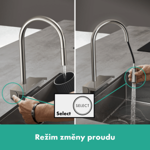 Vysoký půlkruhový výtok se tyčí nad prominentní pracovní plochou. Právě sem firma hansgrohe umístila revoluční typ proudu SatinFlow. Hedvábně měkký, plochý sprchový proud, sestávající ze 133 extrémně jemných jednotlivých paprsků, který dokáže šetrně a velmi efektivně omýt choulostivé potraviny. Spolu s dodávaným multifunkčním sítkem F14 optimalizuje práci v kuchyni, ze které se tak stává potěšení.