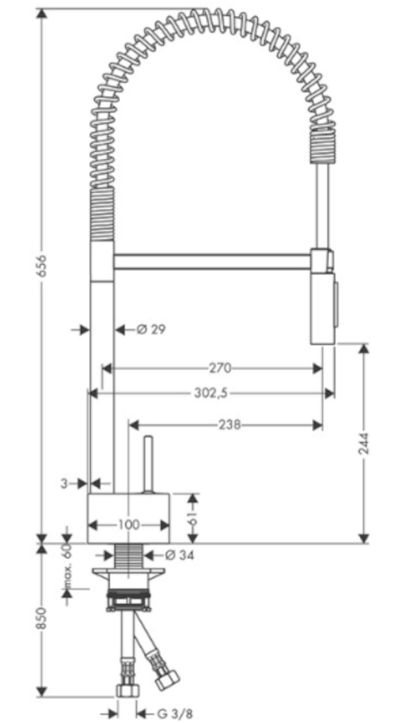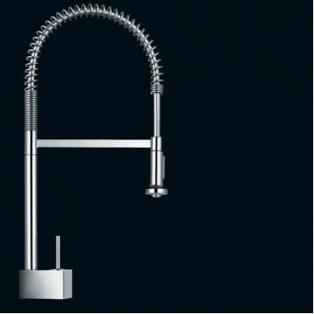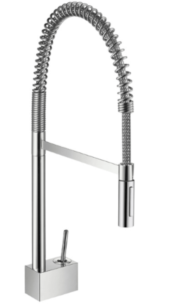 Dřezová baterie Axor Starck disponuje vytahovací sprškou, rozsahem otáčení až 360°, normálním a sprchovým proudem. Současně je možné zpětné nastavení proudu stisknutím tlačítka.