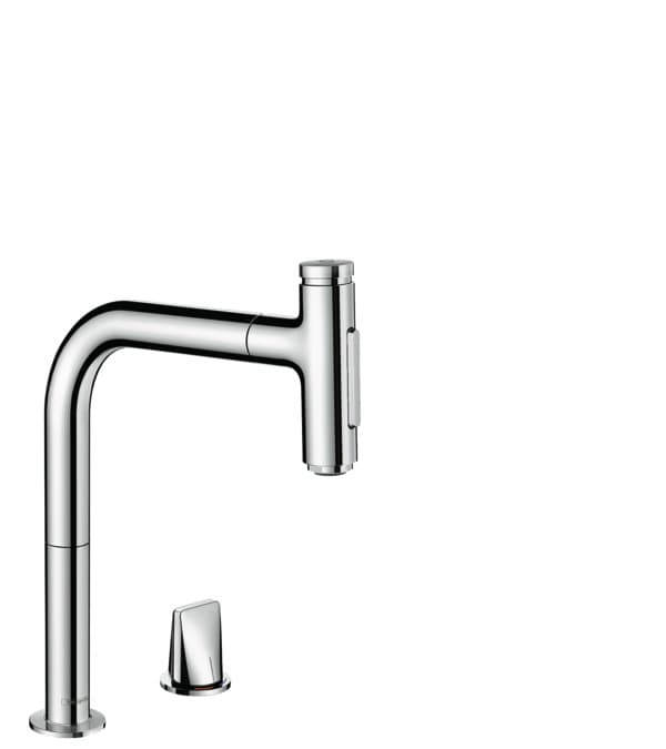 Dvouotvorová páková kuchyňská baterie Metris M71 200 s vytahovací sprškou, 2 typy proudu od hansgrohe učiní z každodenní práce u dřezu potěšení. Kyvná páka je umístěna v dosahu ruky odděleně od kuchyňské baterie. Ovládá množství a teplotu vody.