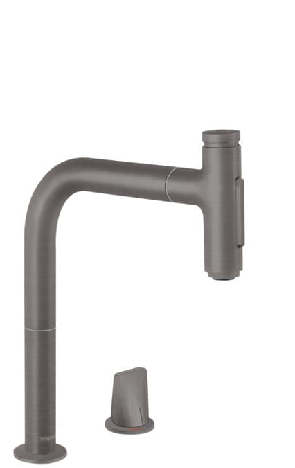 Dvouotvorová páková kuchyňská baterie Metris M71 200 s vytahovací sprškou, 2 typy proudu a sBoxem v kartáčovaném černém chromu od hansgrohe spojuje inovativní komfortní ovládání a barvu. Kyvná páka k ovládání množství a teploty vody je umístěna na dosah ruky, ale mimo kuchyňskou baterii. Voda se zapíná a vypíná stiskem tlačítka (Select), které se nachází přímo na ergonomicky tvarovaném vytahovacím výtoku. Další plus: vzdálenost 208 mm otočným mezi výtokem a kuchyňským dřezem (ComfortZone 200). Funkčním designovým prvkem jsou i oba typy proudu: průzračný laminární proud s průtokem 7 l/min (při tlaku 3 bary) k rychlému napouštění nádob a jemný sprchový proud s průtokem 3,5 l/min (při tlaku 3 bary) k šetrnému mytí ovoce a zeleniny. Volba typu vodního proudu se provádí tlačítkem přímo na výtoku. Přesvědčivý vzhled: Kuchyňská baterie s moderním výtokem ve tvaru L a kartáčovaným povrchem v kovově černém chromu vytváří vzrušující kontrast.