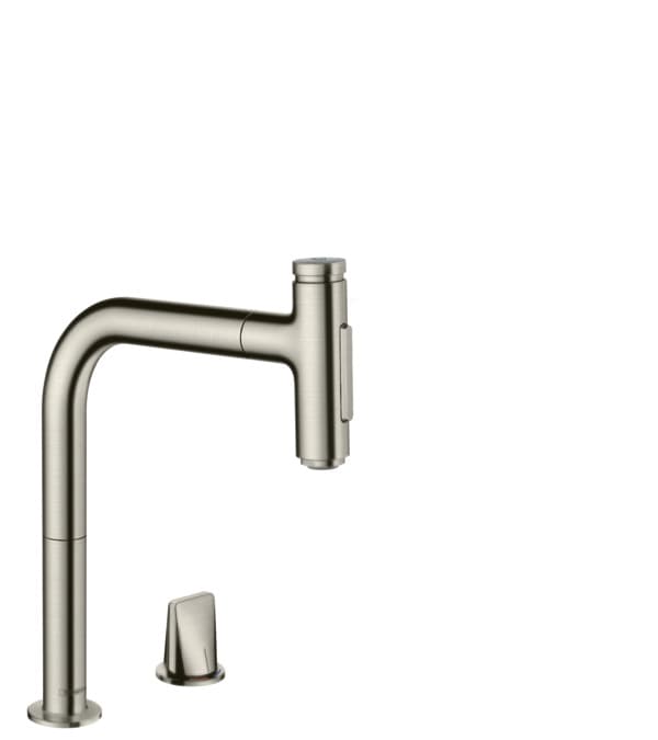 Dvouotvorová páková kuchyňská baterie Metris M71 200 s vytahovací sprškou, 2 typy proudu od hansgrohe učiní z každodenní práce u dřezu potěšení. Kyvná páka je umístěna v dosahu ruky odděleně od kuchyňské baterie. Ovládá množství a teplotu vody.