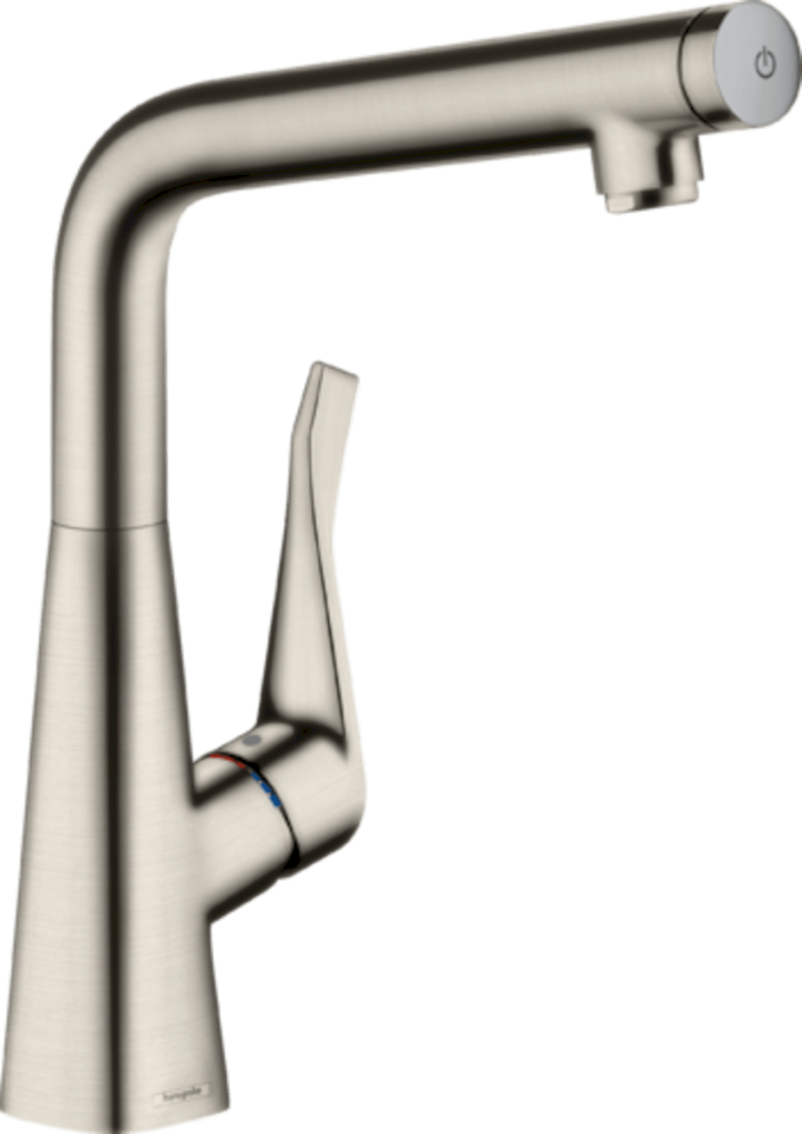 Páková kuchyňská baterie hansgrohe Metris Select v nerezovém provedení, s komfortní výškou 320, stanoví v moderní kuchyni díky svému tvaru a funkci individuální akcenty. Ergonomický design s komfortní výškou výtoku poskytuje větší prostor pro každodenní kuchyňské práce a umožňuje bez problémů manipulovat i velkými nádobami (ComfortZone 320).