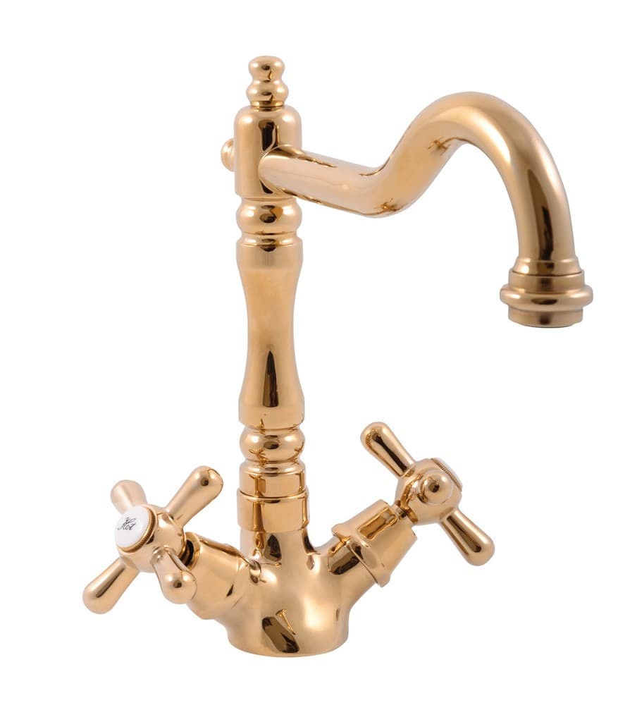 PARAMETRY:Balení: 1 ksHmotnost balení: 1,94  kgDruh výrobku: dřezová baterie Materiál: mosaz Barva popisná: zlatá lesklá Barva základní: zlatá lesk/mat: lesk Typ baterie: stojánková Ovládání:...