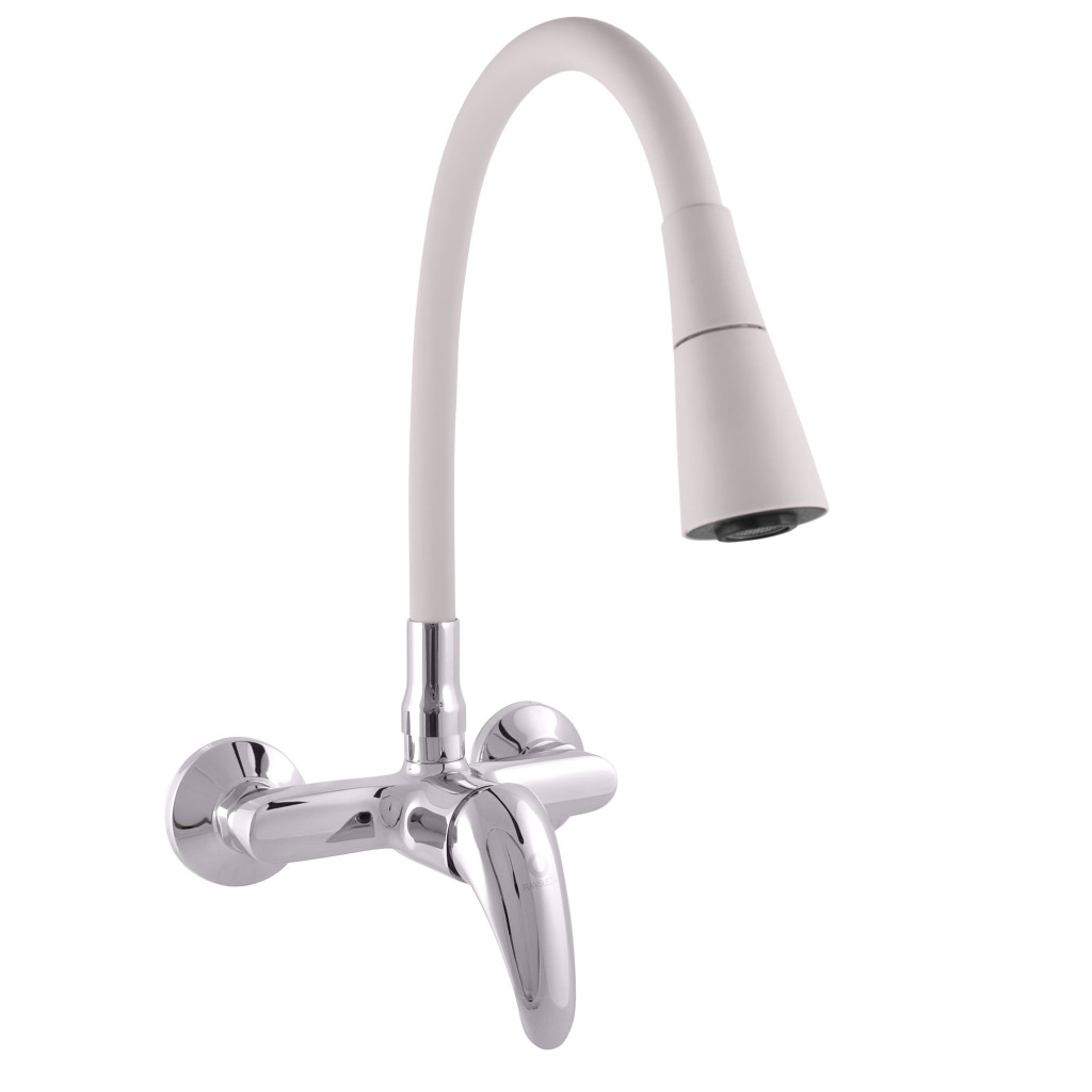 Vodovodní baterie dřezová nástěnná s flexibilním otočným ramínkem se sprchou.