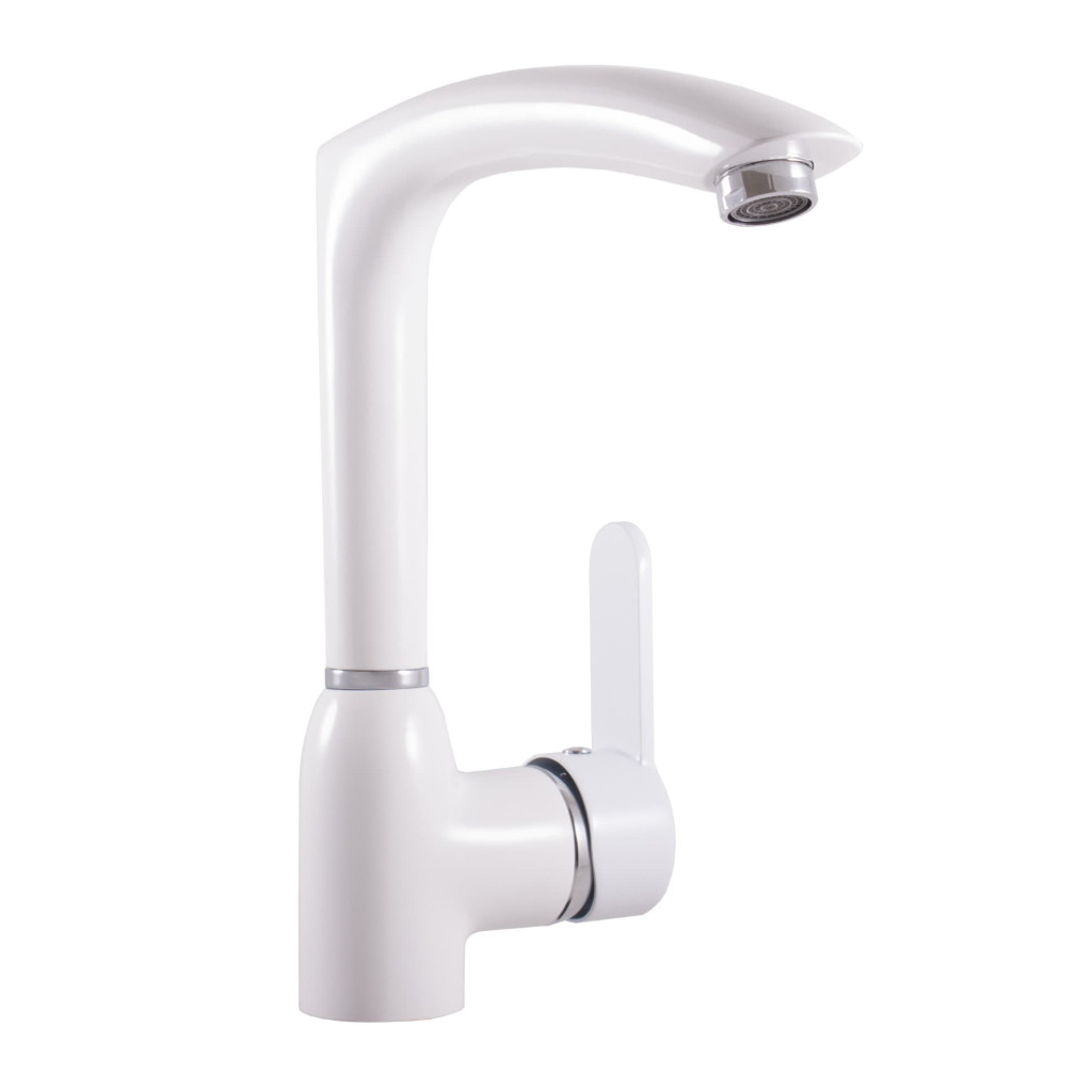 PARAMETRY:Balení: 1 ksHmotnost balení: 1,88  kgDruh výrobku: dřezová baterie Materiál: mosaz Barva popisná: bílá Barva základní: bílá lesk/mat: lesk Typ baterie: stojánková Ovládání: páková Montáž...
