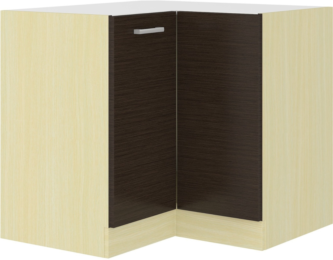 Dolní skříňka rohová CHAMONIX II vyrobená z kvalitního lamina. Korpus i sokl ( 10 cm ) jsou v barvě dub ferrara a dvířka v barvě dub tmavé legno. Rozměry skříňky - šířka 89 x 89 cm, výška 82 cm, hloubka 52 cm. Pracovní deska není v ceně. Úchyty jsou z plastu. Dvířka mají pravé otvírání. V naší nabídce naleznete další výběr skříněk k sestavení celé kuchyně.