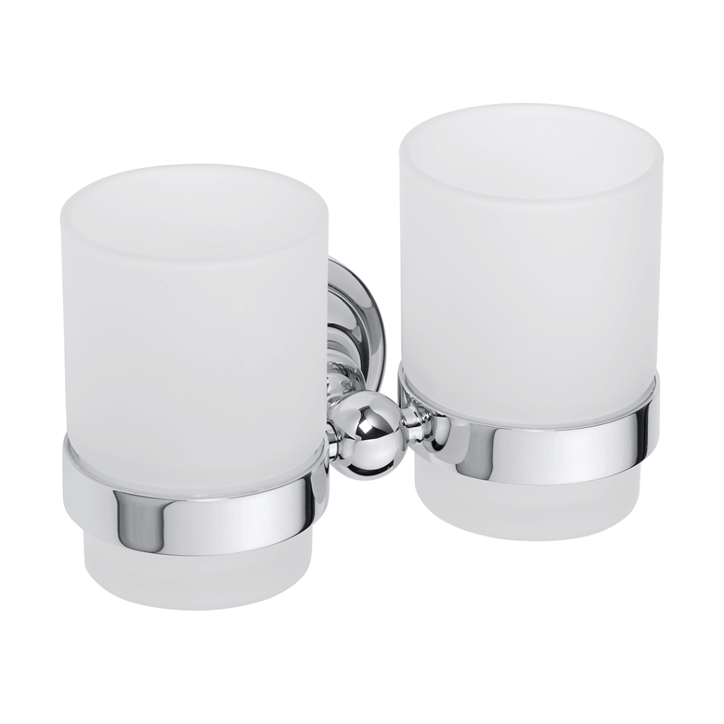 Dvojitý držák skleniček v chromové povrchové úpravě je vhodným doplňkem do každé retro koupelny. Sklenice jsou vyrobeny v kombinaci s mléčným sklem. Tento typ skla je vhodný právě do koupelen a kuchyní, kde vzniká největší provoz v domácnosti. Na matném povrchu nejsou znatelné drobné kapky a šmouhy.