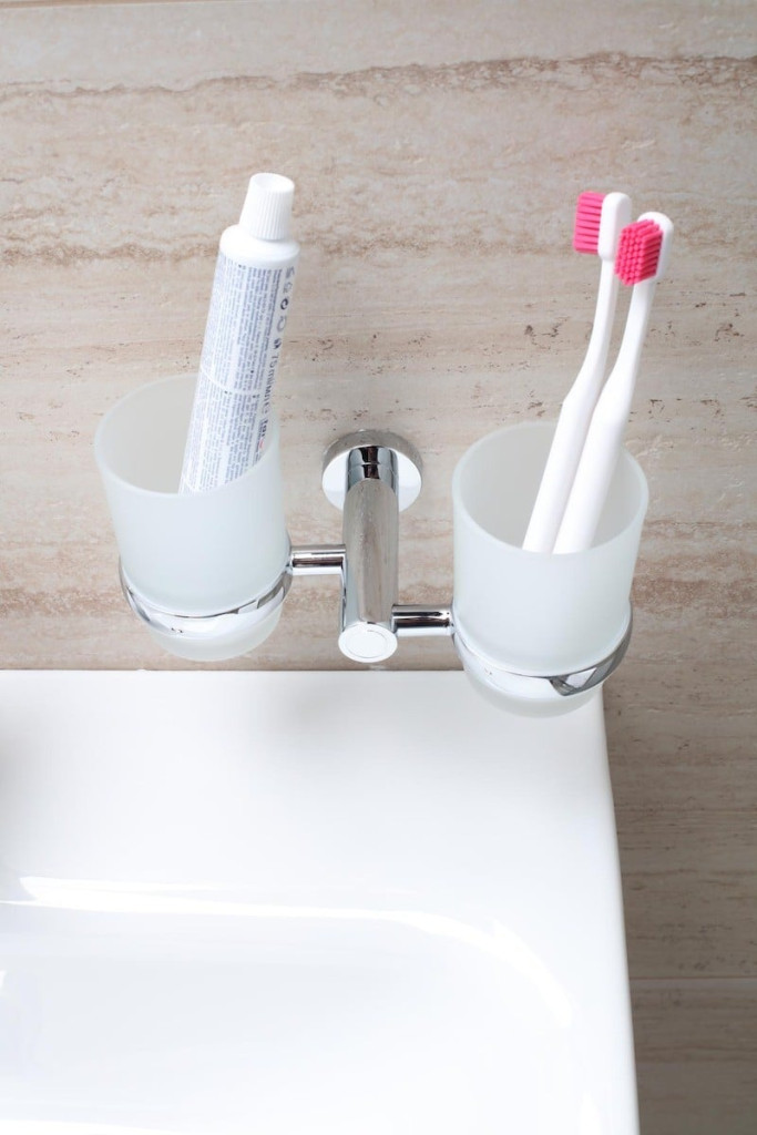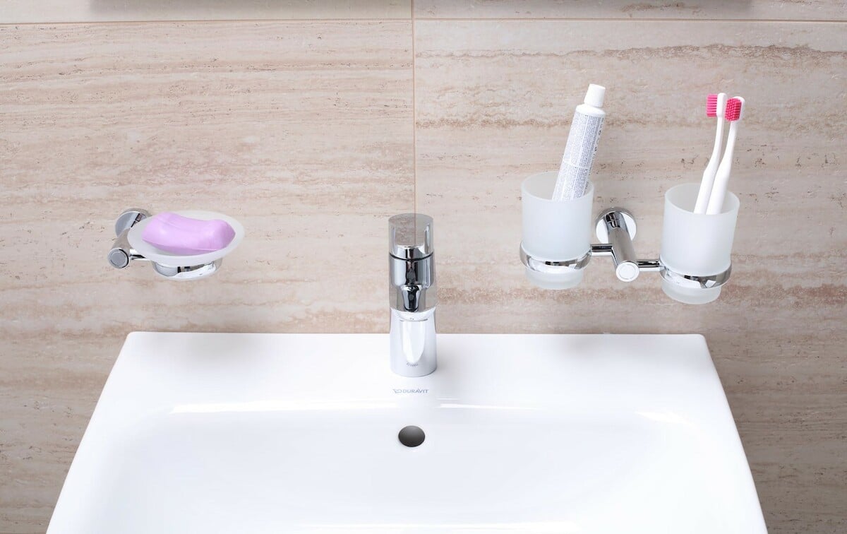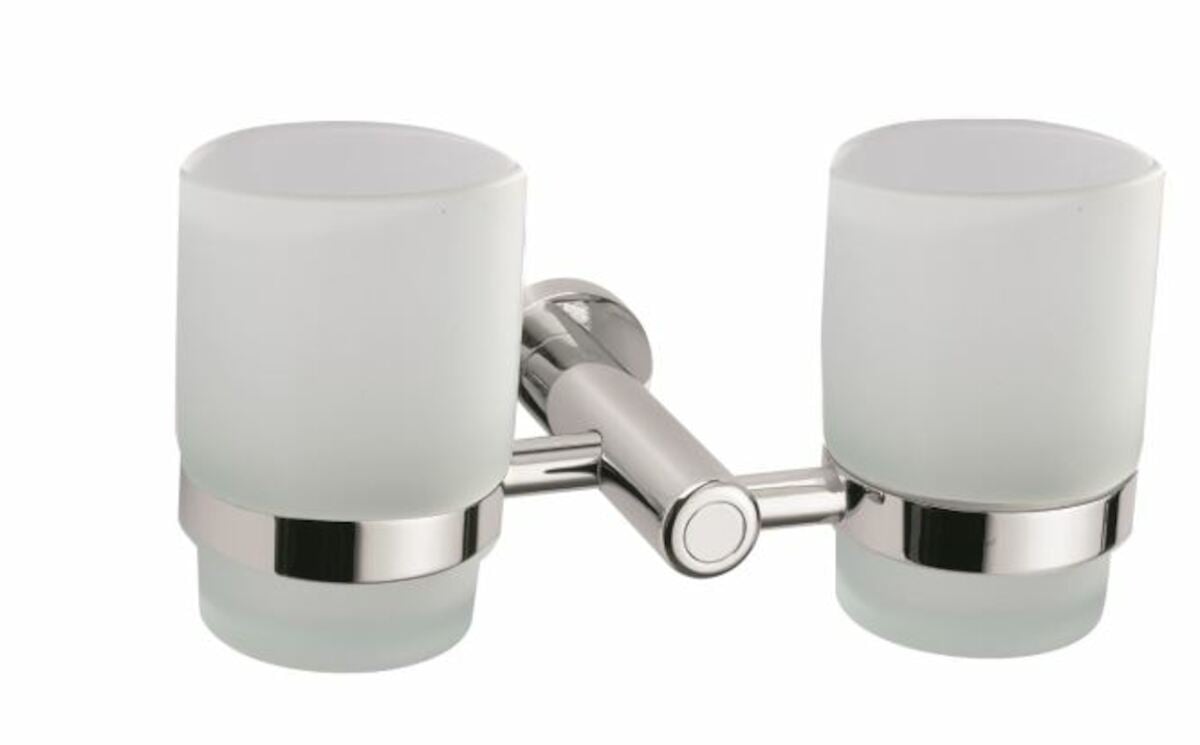 Dvojitý držák skleniček Soft je praktickým pomocníkem v každé koupelně. Díky dvěma přiloženým skleničkám si snadno uspořádáte veškeré hygienické potřeby.